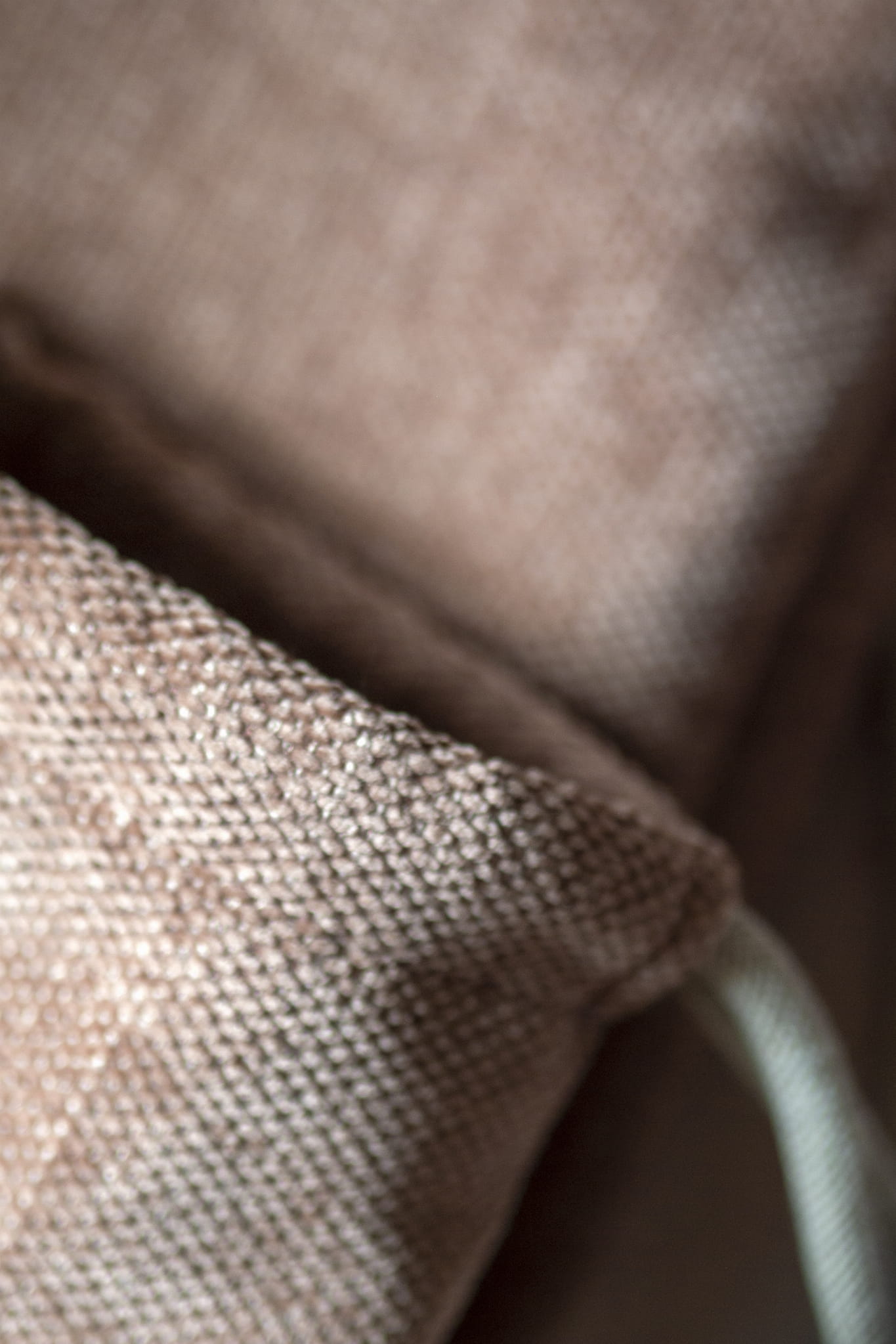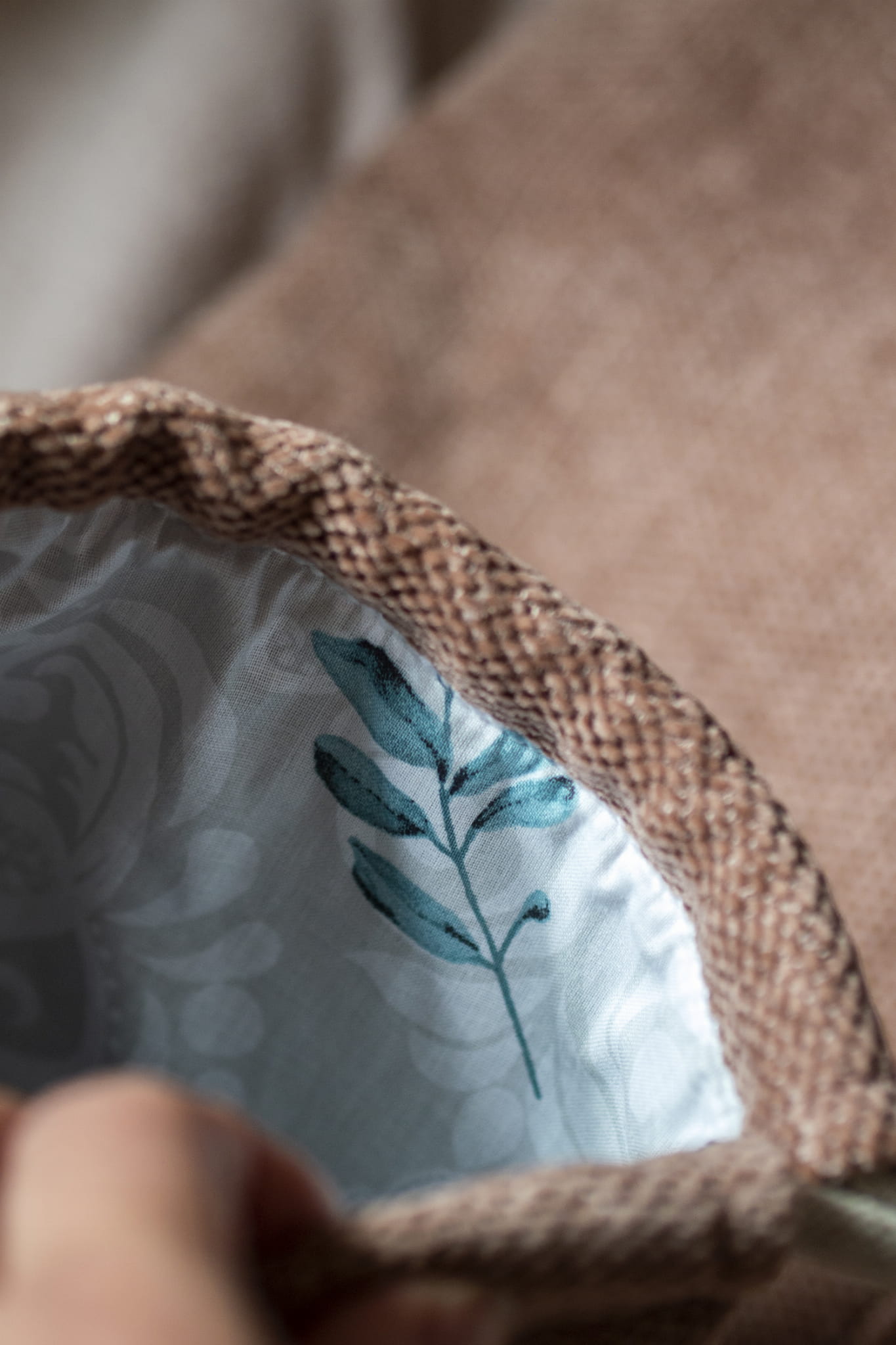 Biała, bawełniana podszewka we wzory, okrągłe dno. Całości dopełnia gruby, bawełniany sznurek w kolorze beżowym.