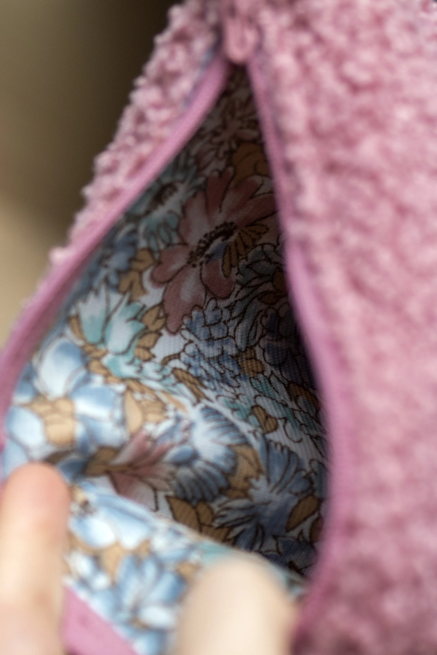 Kosmetyczka jest zapinana na suwak, w środku bawełniana podszewka.