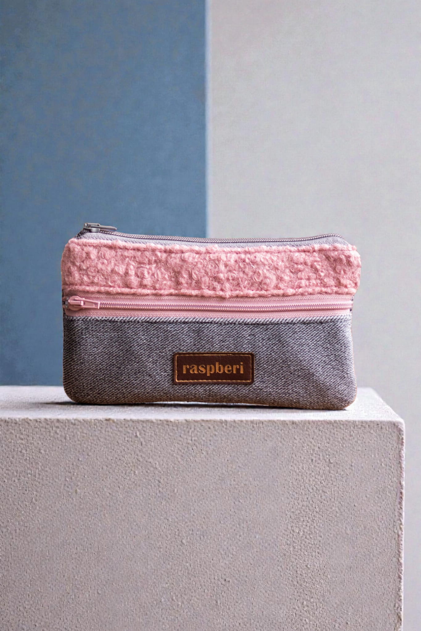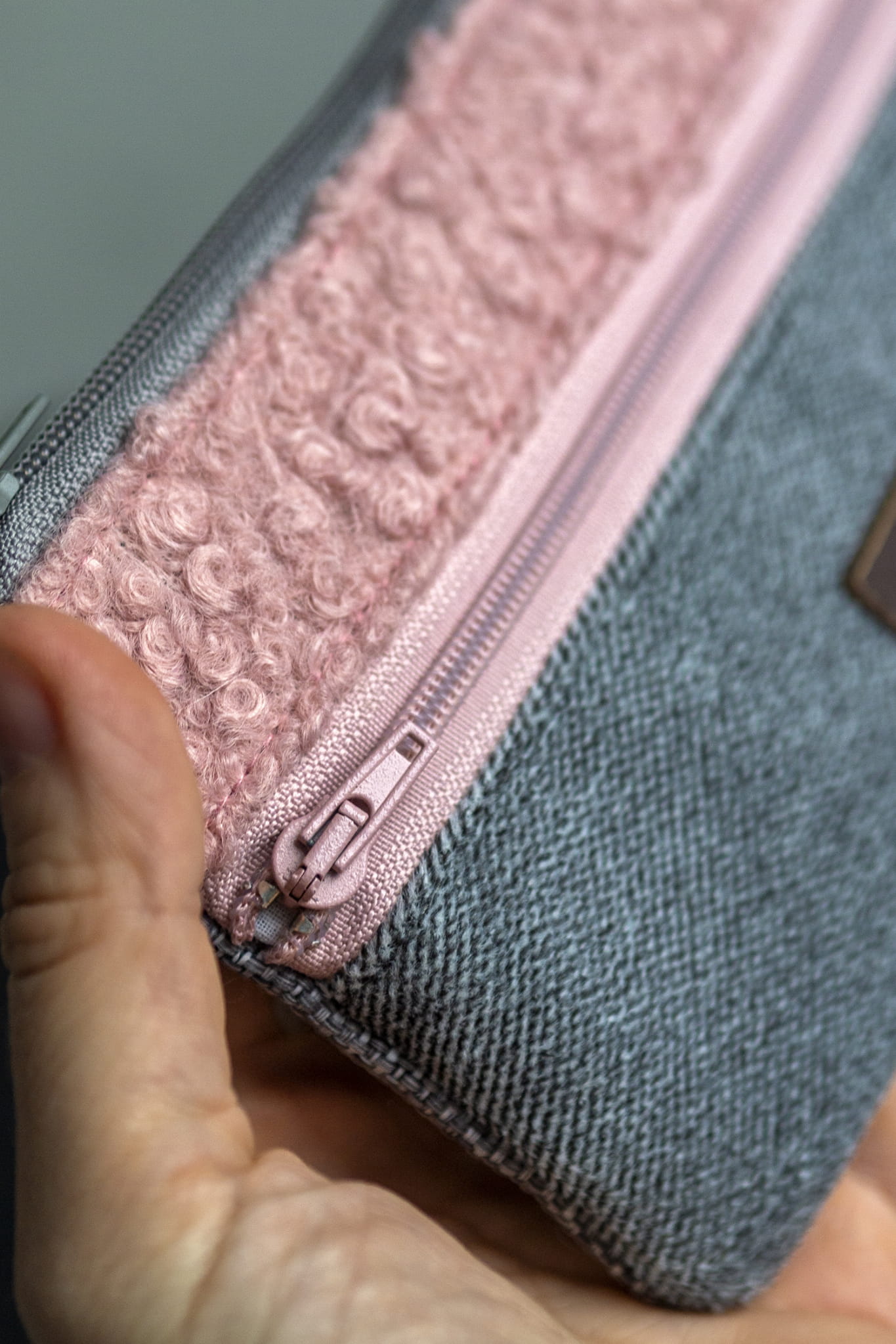 Prosty wodoodporny portfel wykonany z kilku rodzajów tkanin w odcieniach szarości i różu.
