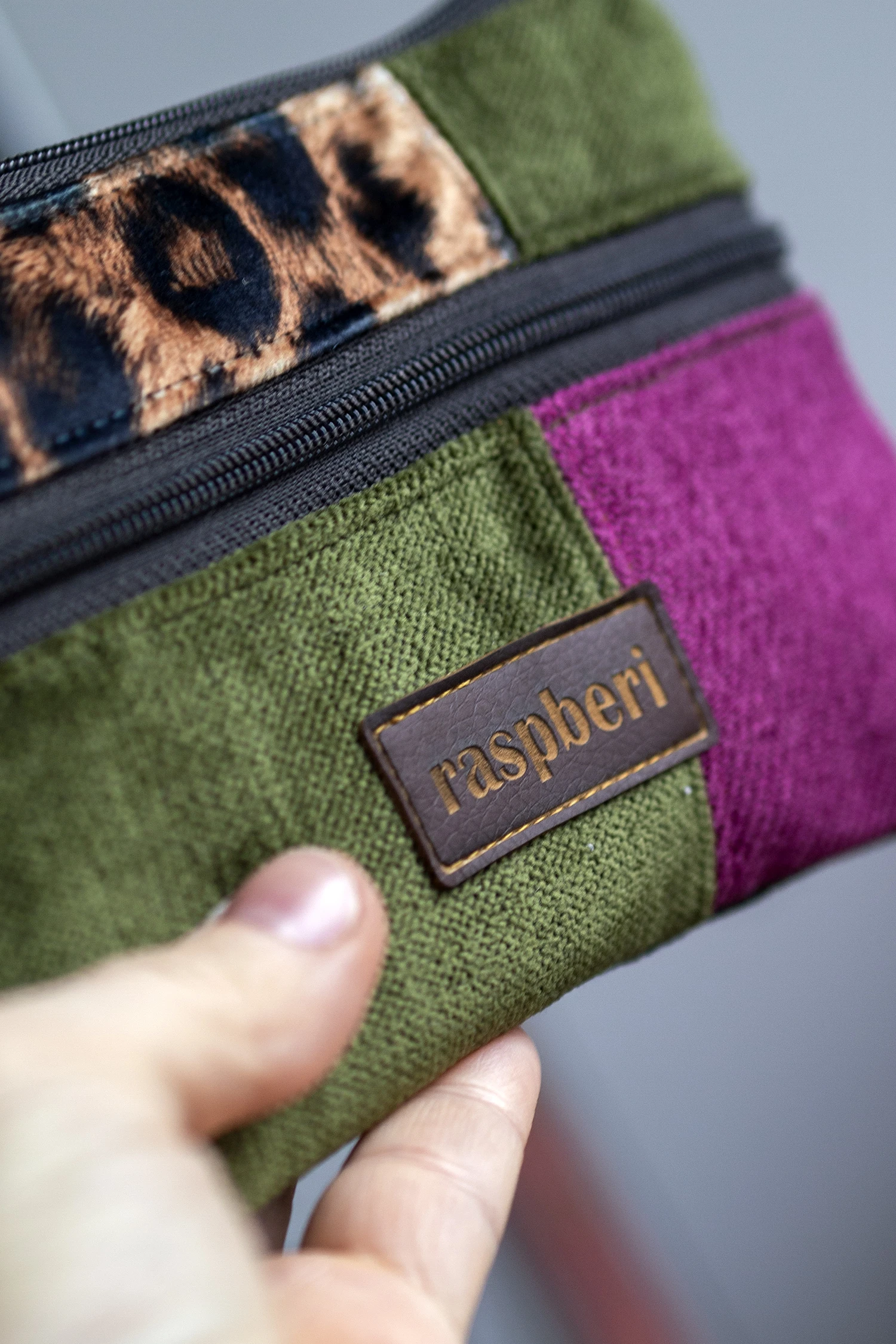 Prosty wodoodporny portfel w kolorze różowo-zielono-grafitowym z dodatkiem weluru w panterkę.