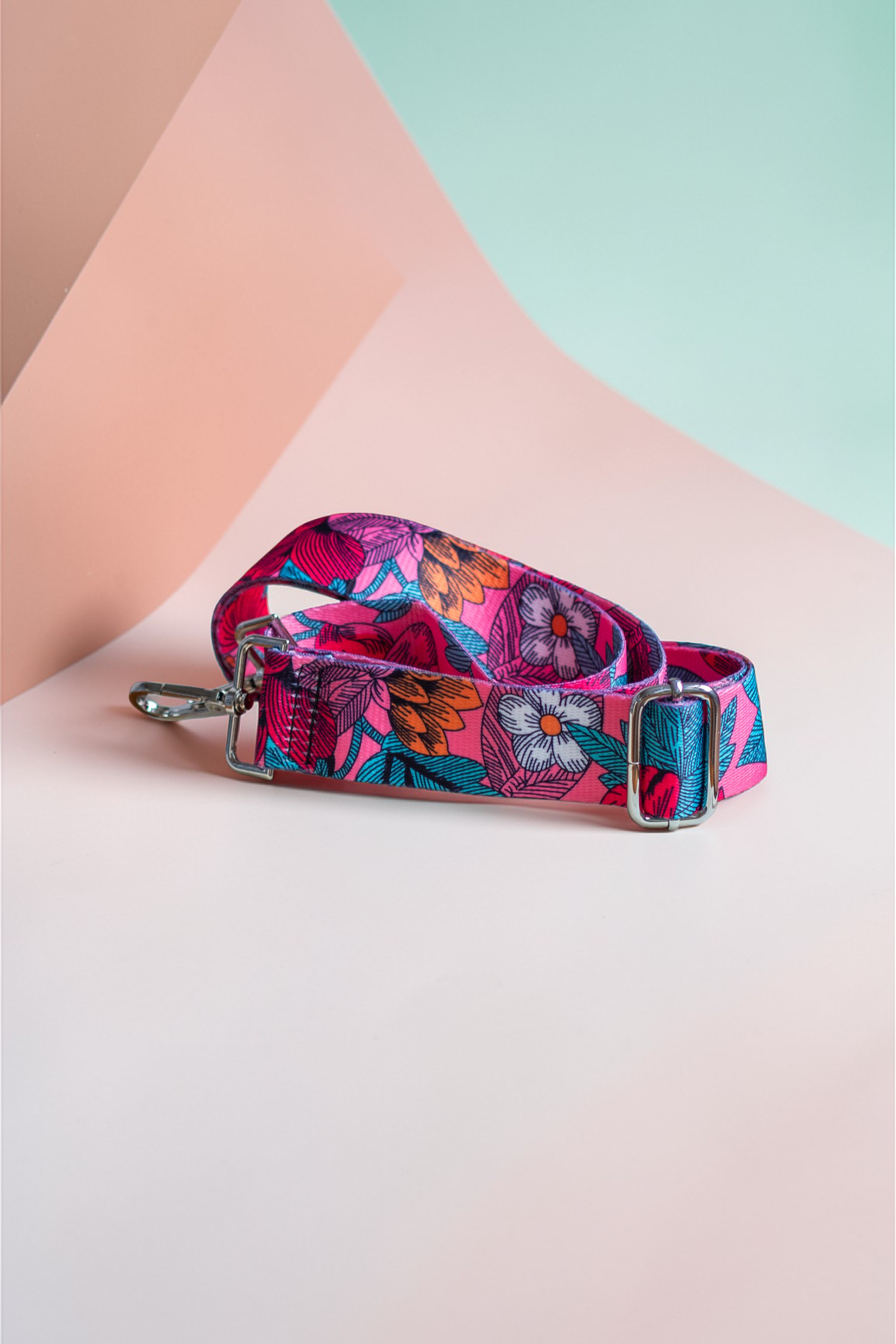 Regulowany pasek w kolorze różowym w kwiaty. Srebrne okucia.