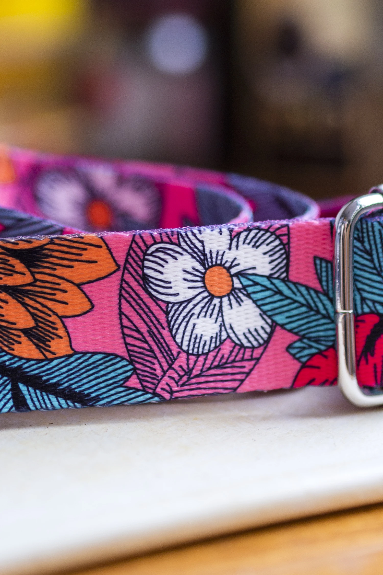 Regulowany pasek w kolorze różowym w kwiaty. Srebrne okucia.