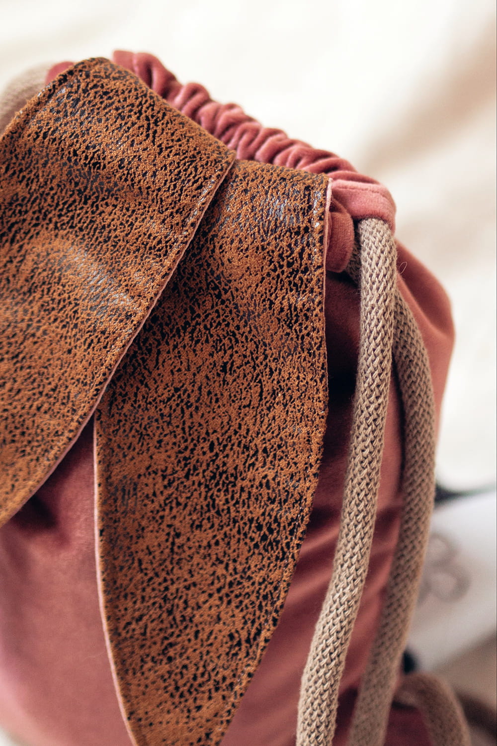 Dziecięcy plecaczek worek wykonany z pudroworóżowego weluru. Uszy królika. Bawełniane sznurki w kolorze kawowym.