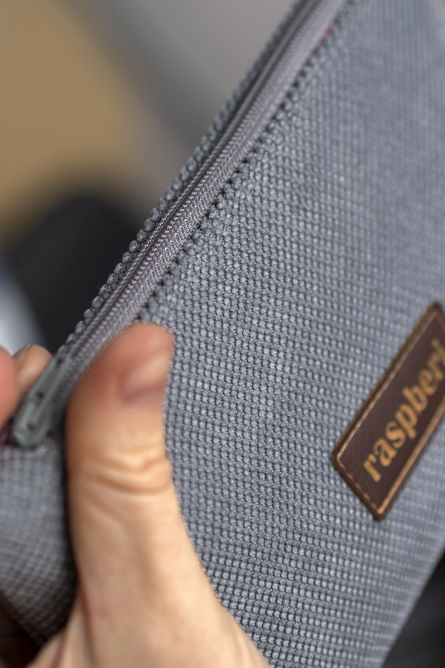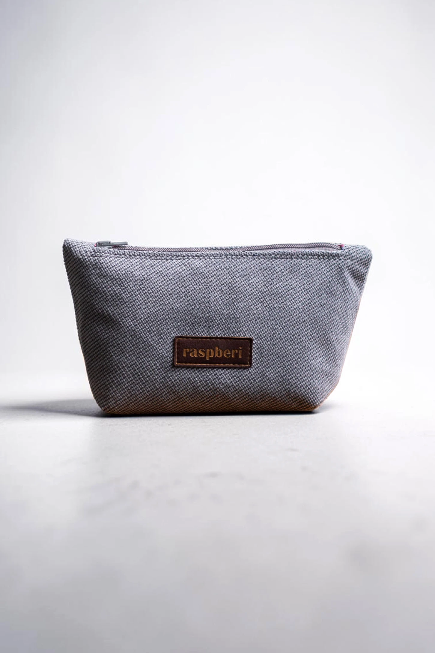 Średniej wielkości kosmetyczka w kolorze szarym.