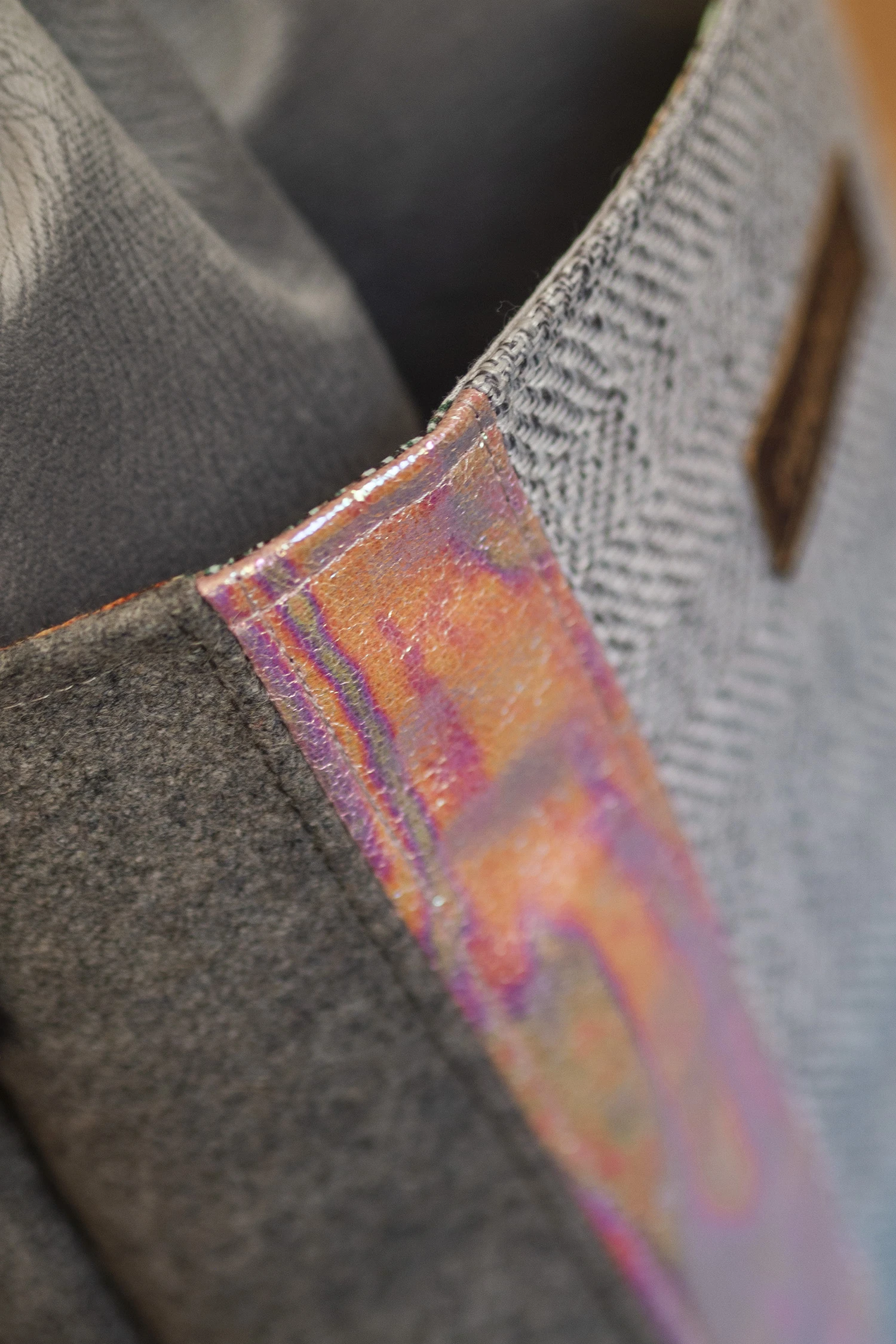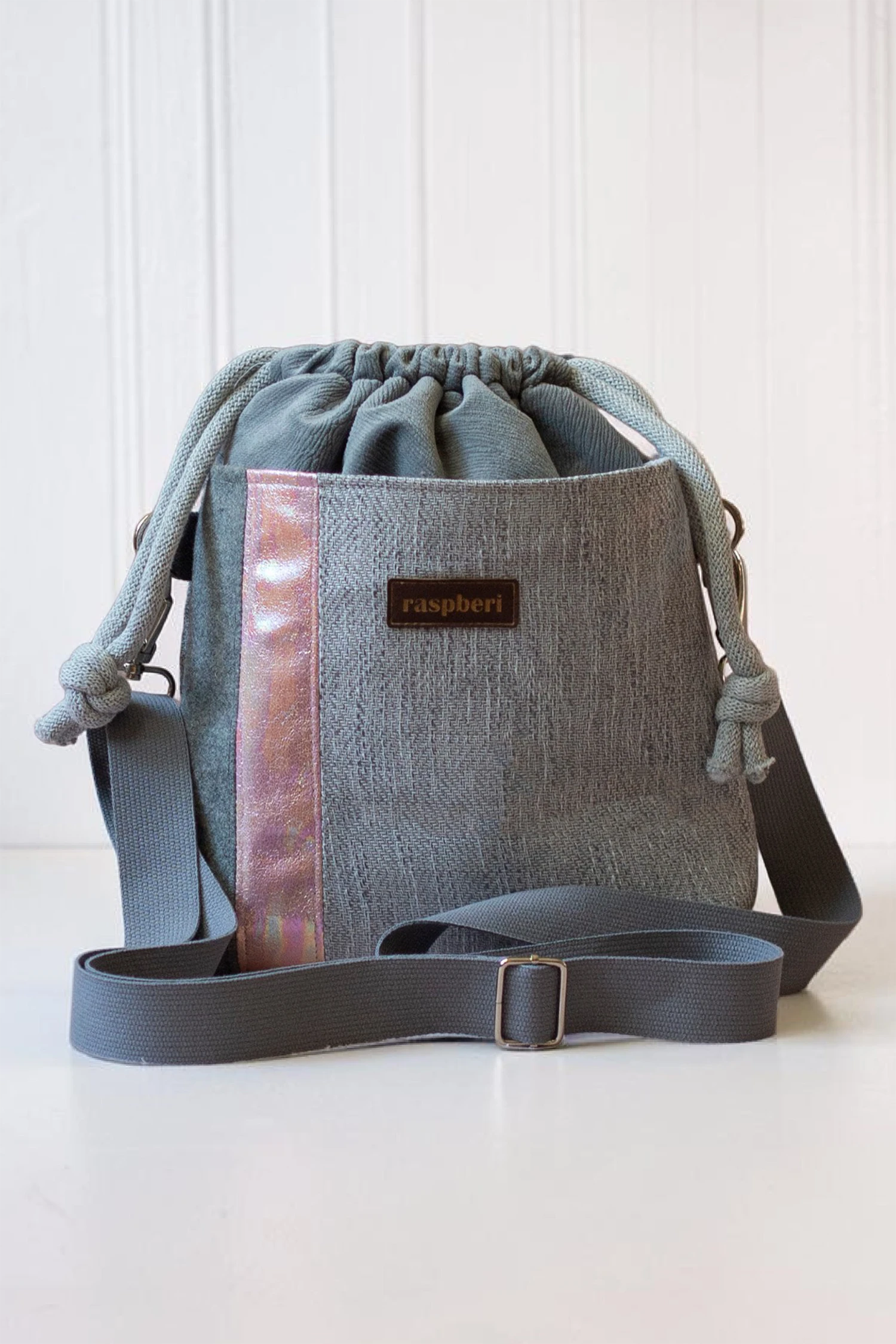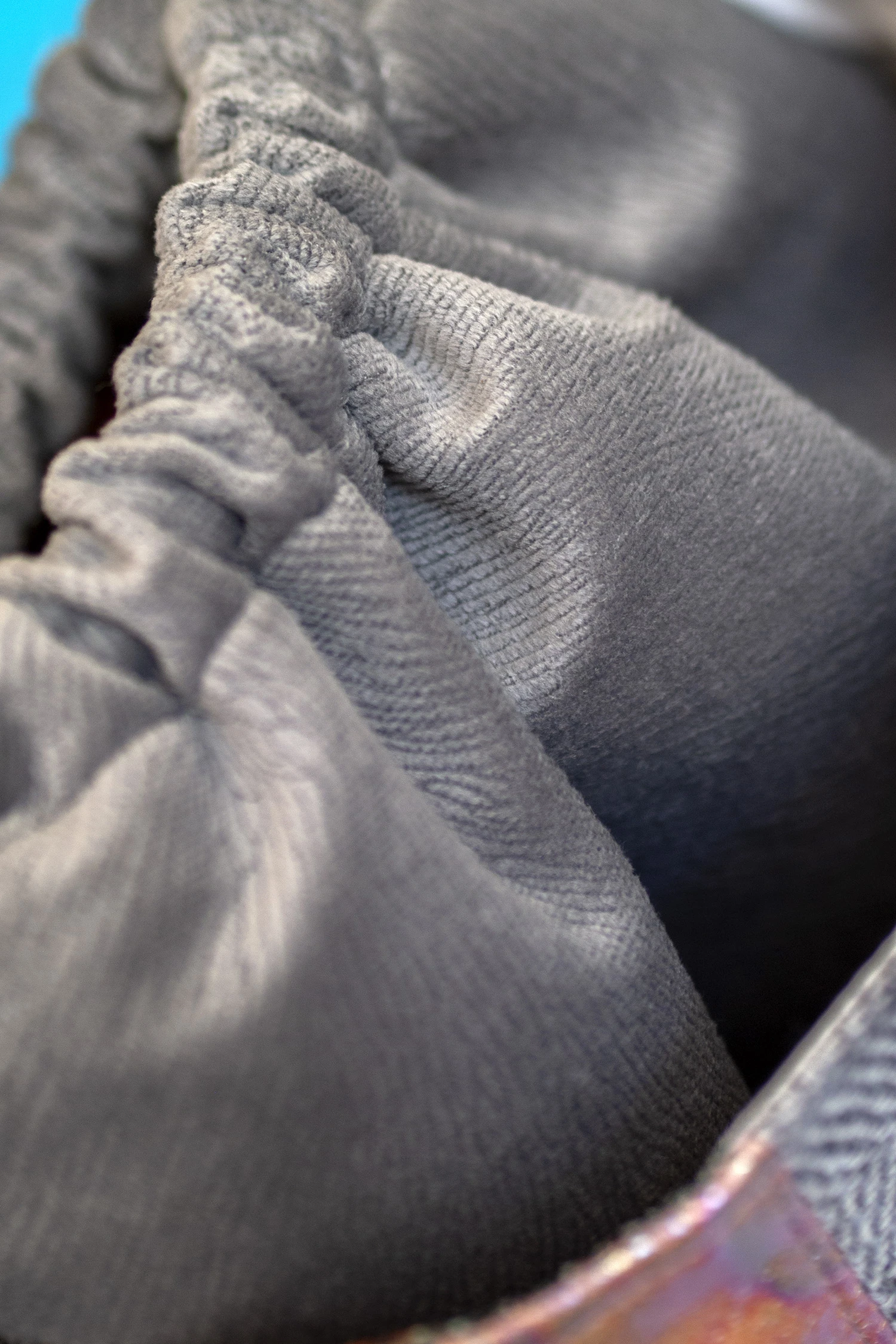 Wykonana z szarego weluru. Z przodu oraz z na tyle torebki kieszenie (np. na telefon czy chusteczki) z kilku rodzajów tkanin tworzących wspólnie ciekawą wizualnie całość. Stworzona w duchu no waste.