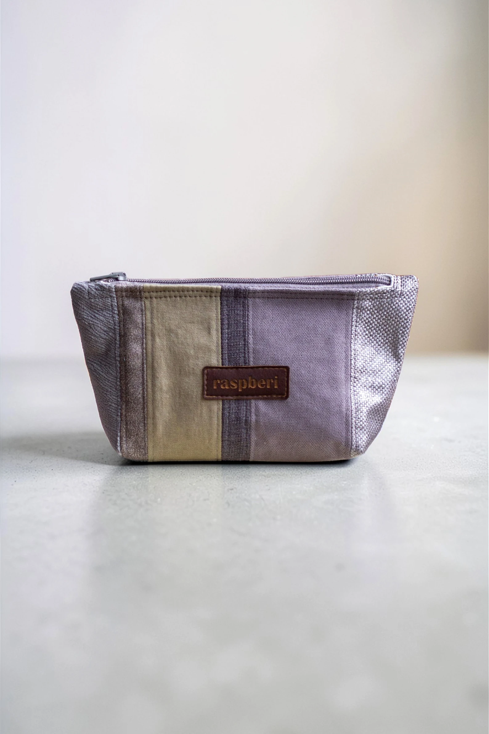 Średniej wielkości kosmetyczka wykonana kilku rodzajów tkanin. Stworzona w duchu no waste.