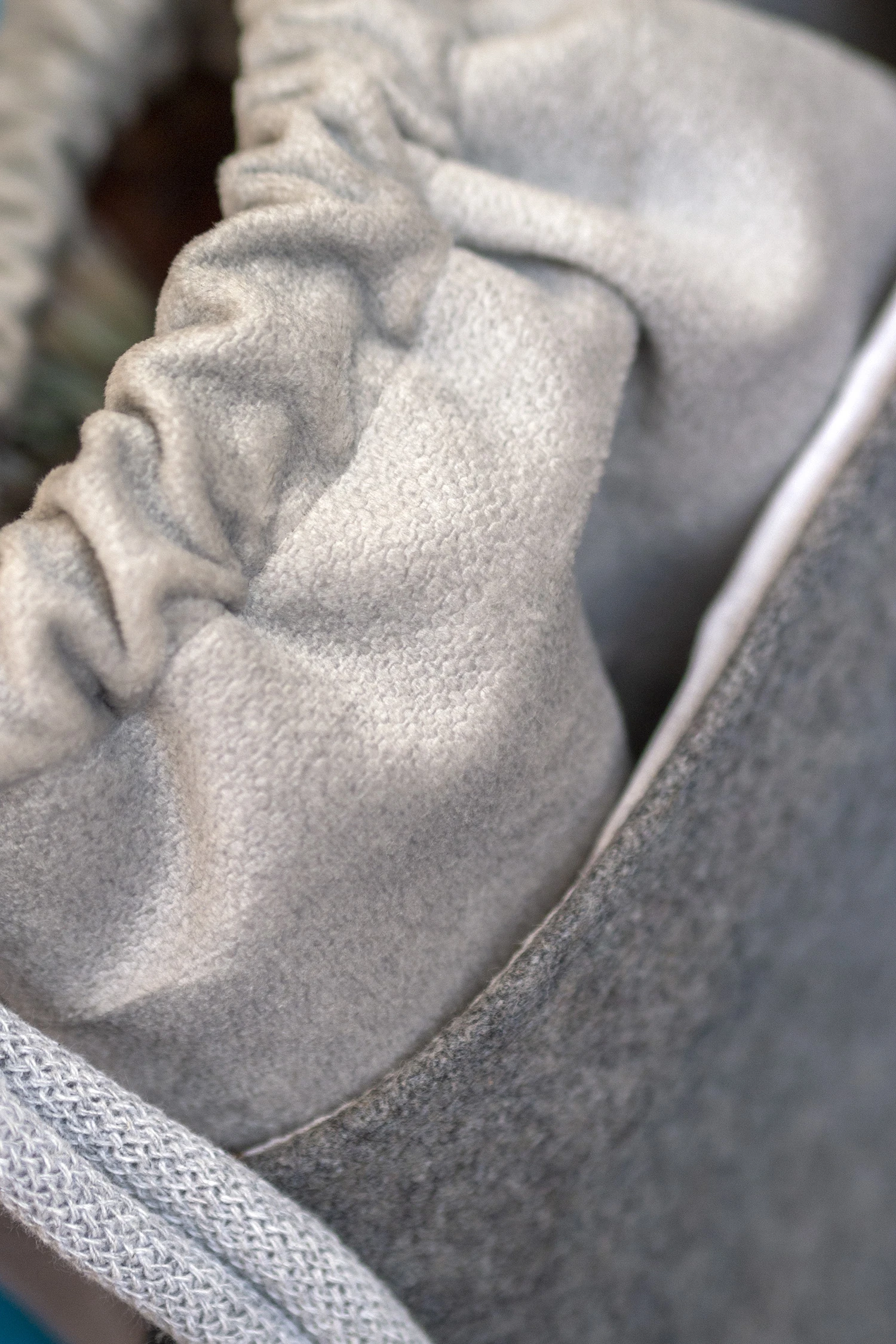 Całość ściągana grubym, bawełnianym sznurkiem w kolorze jasnoszarym.