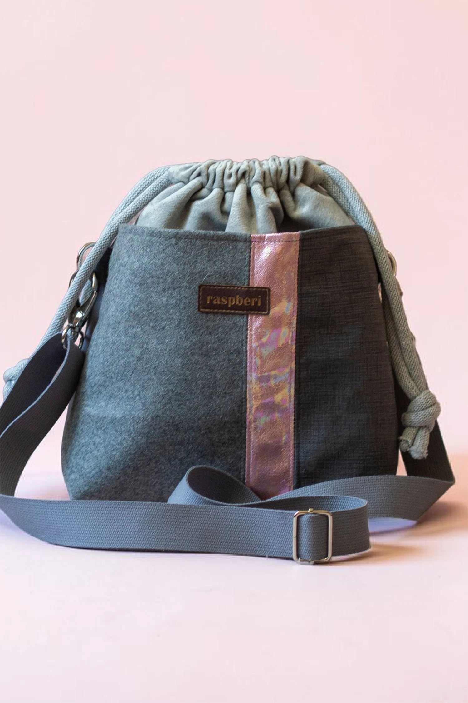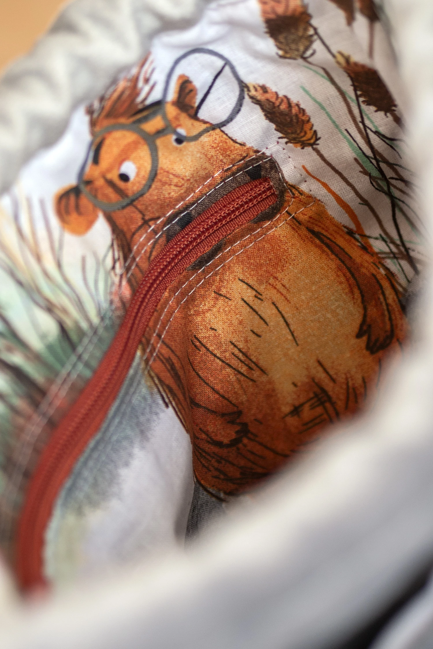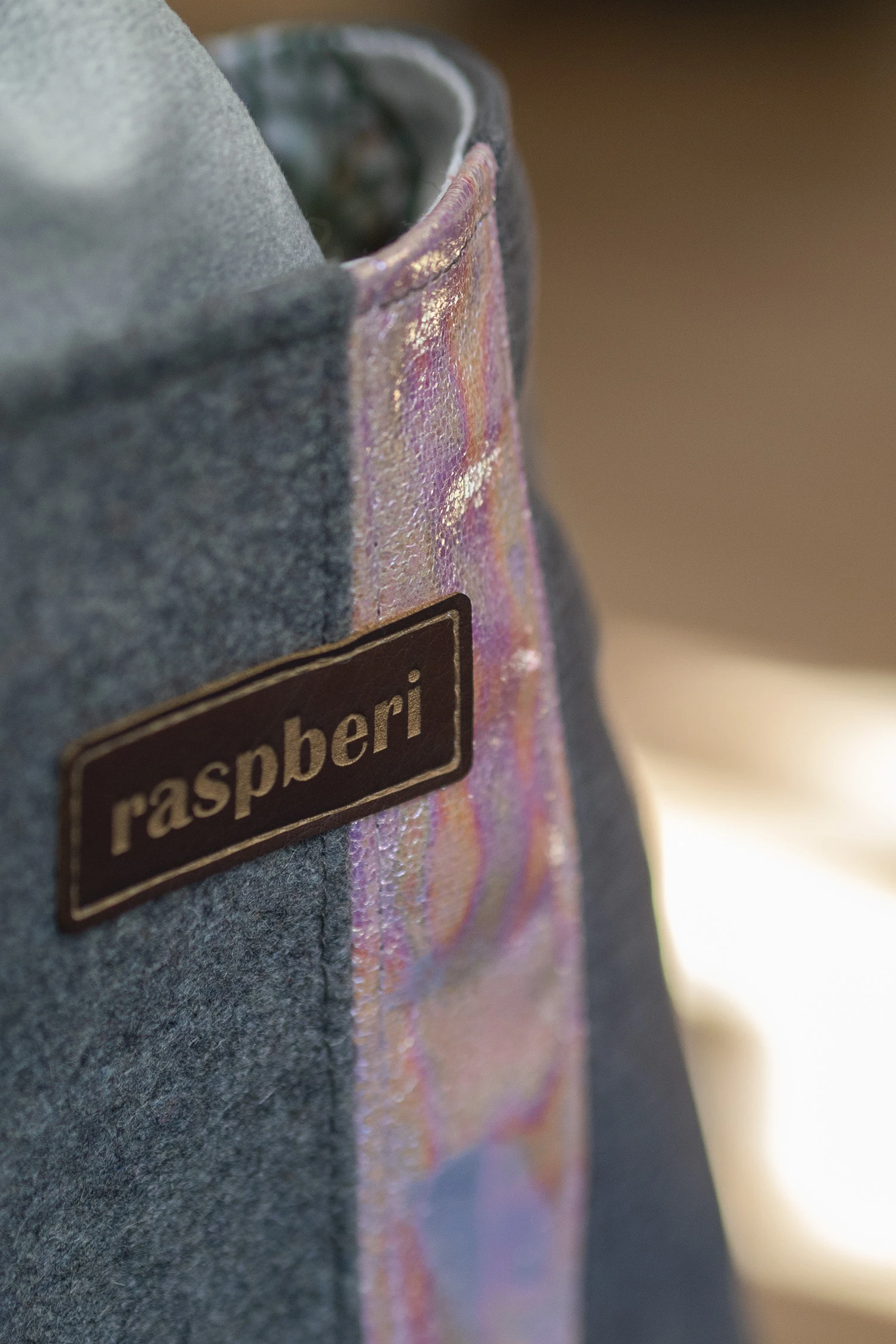 Wykonana z szarego weluru. Z przodu oraz z na tyle torebki kieszenie (np. na telefon czy chusteczki) z kilku rodzajów tkanin tworzących wspólnie ciekawą wizualnie całość. Stworzona w duchu no waste.