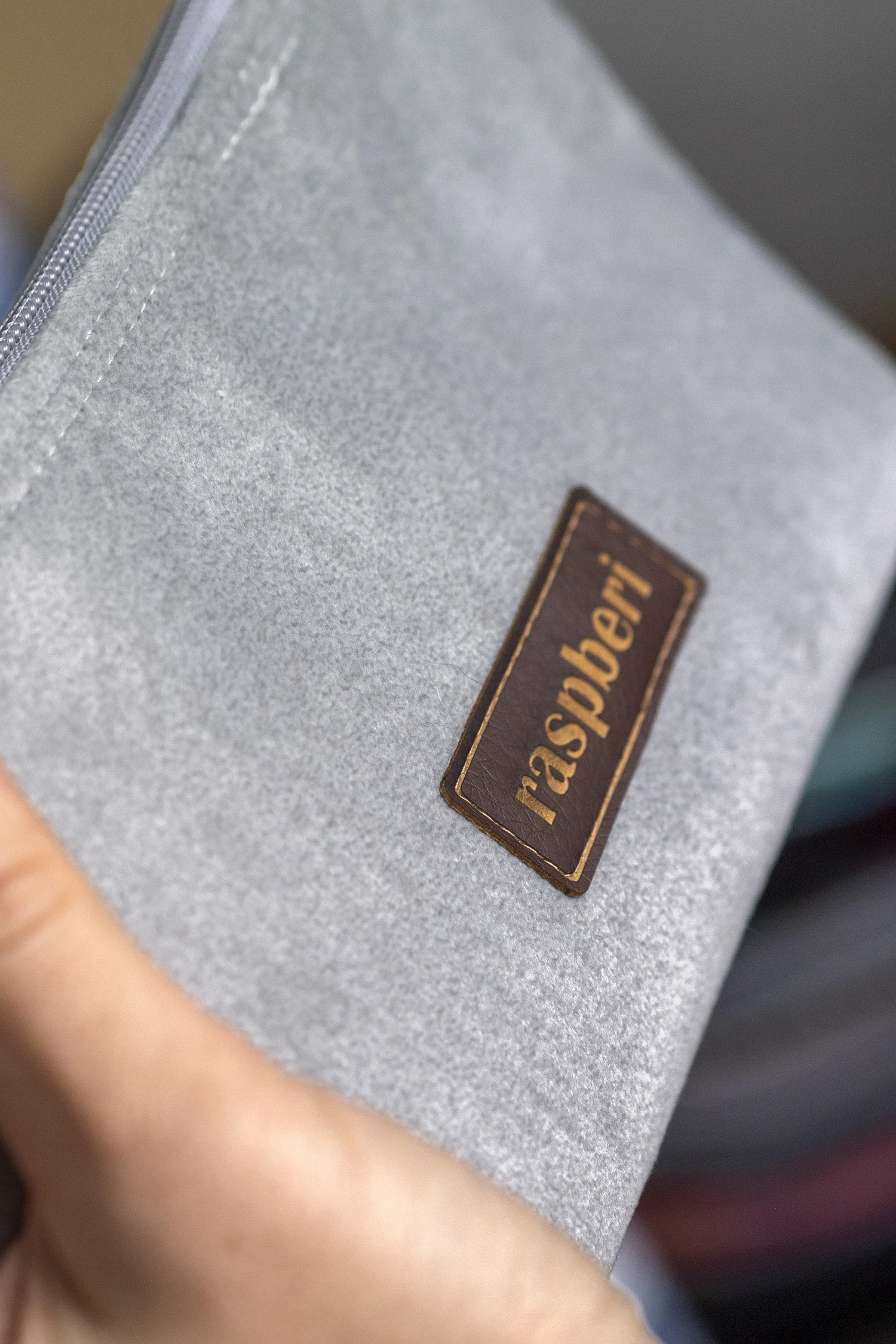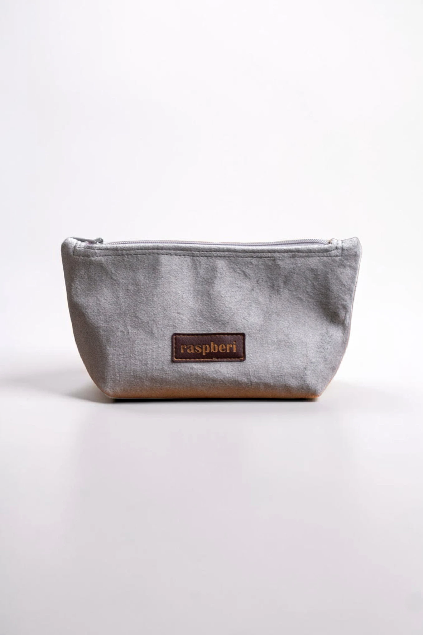 Średniej wielkości kosmetyczka w kolorze szarym wykonana z weluru.