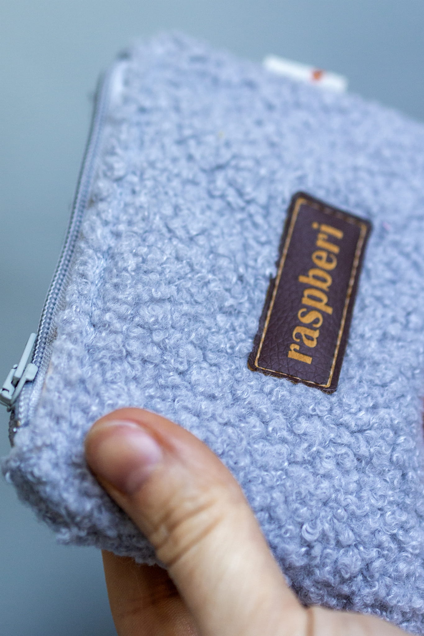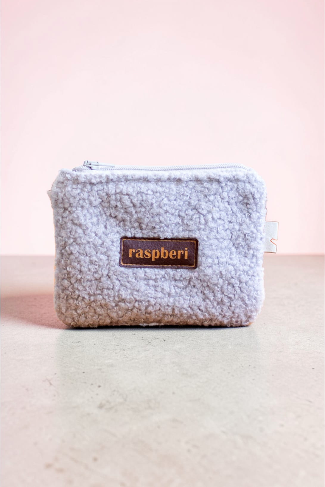 Prosty wodoodporny portfel wykonany z szarej tkaniny typu "baranek".