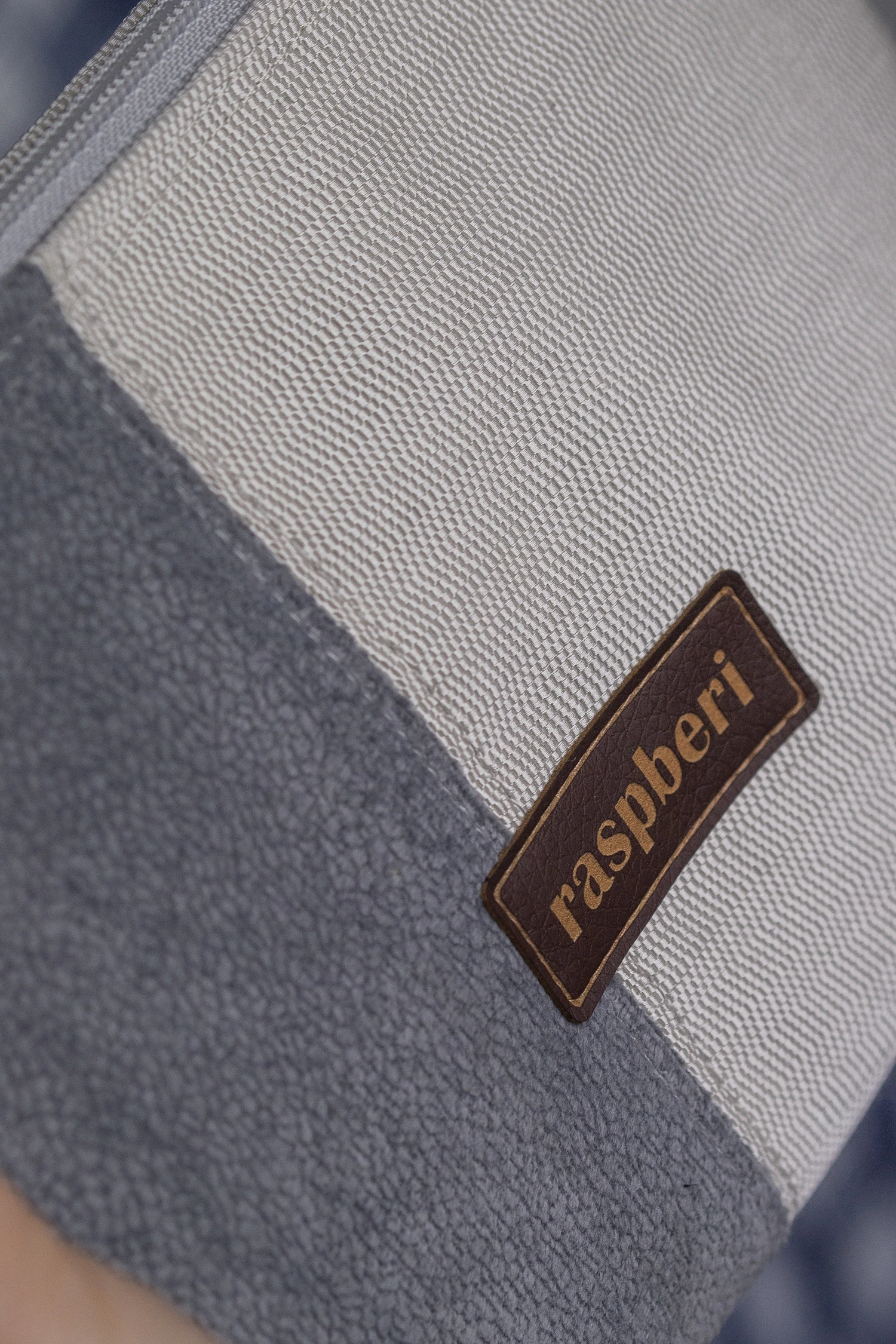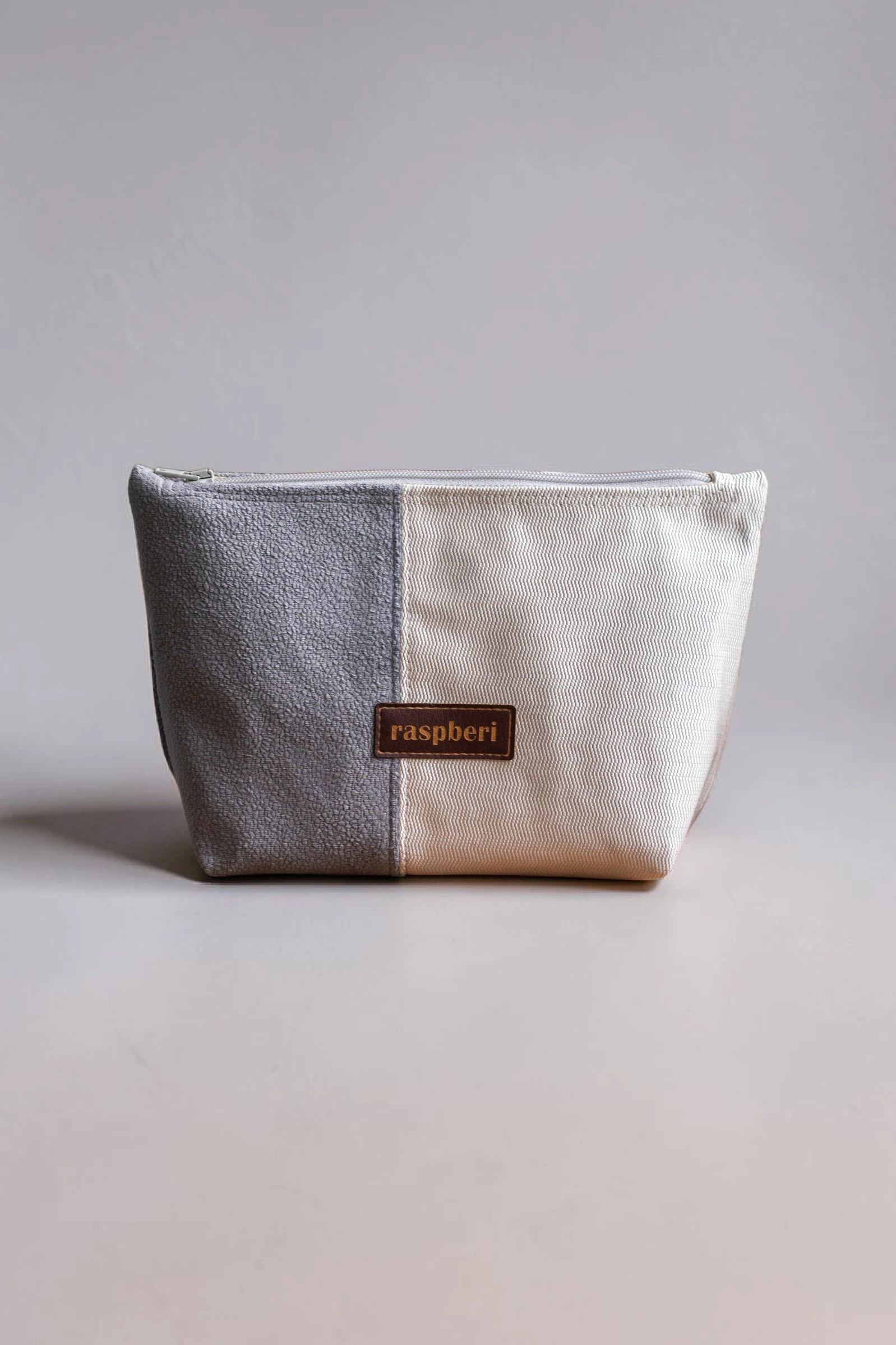 Duża kosmetyczka w kolorze szaro-kremowym. Stworzona w duchu no waste.