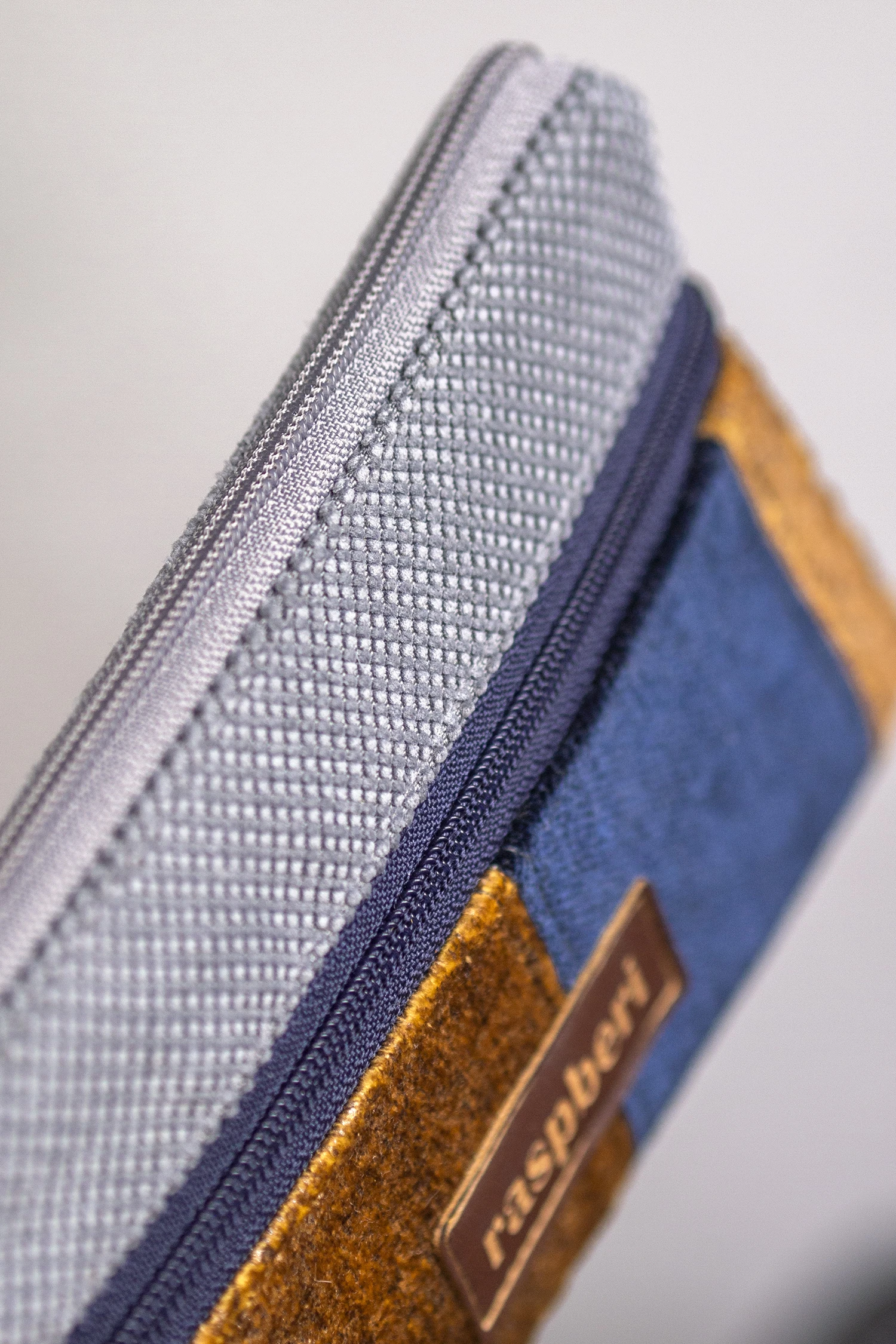 Prosty wodoodporny portfel wykonany z kilku rodzajów tkanin w odcieniach szarości, miodu i granatu.