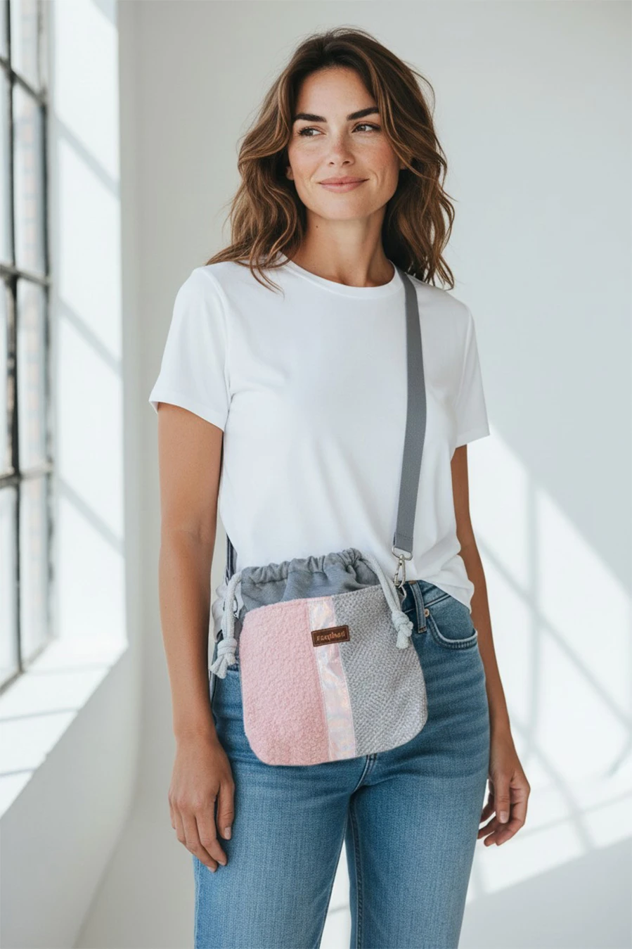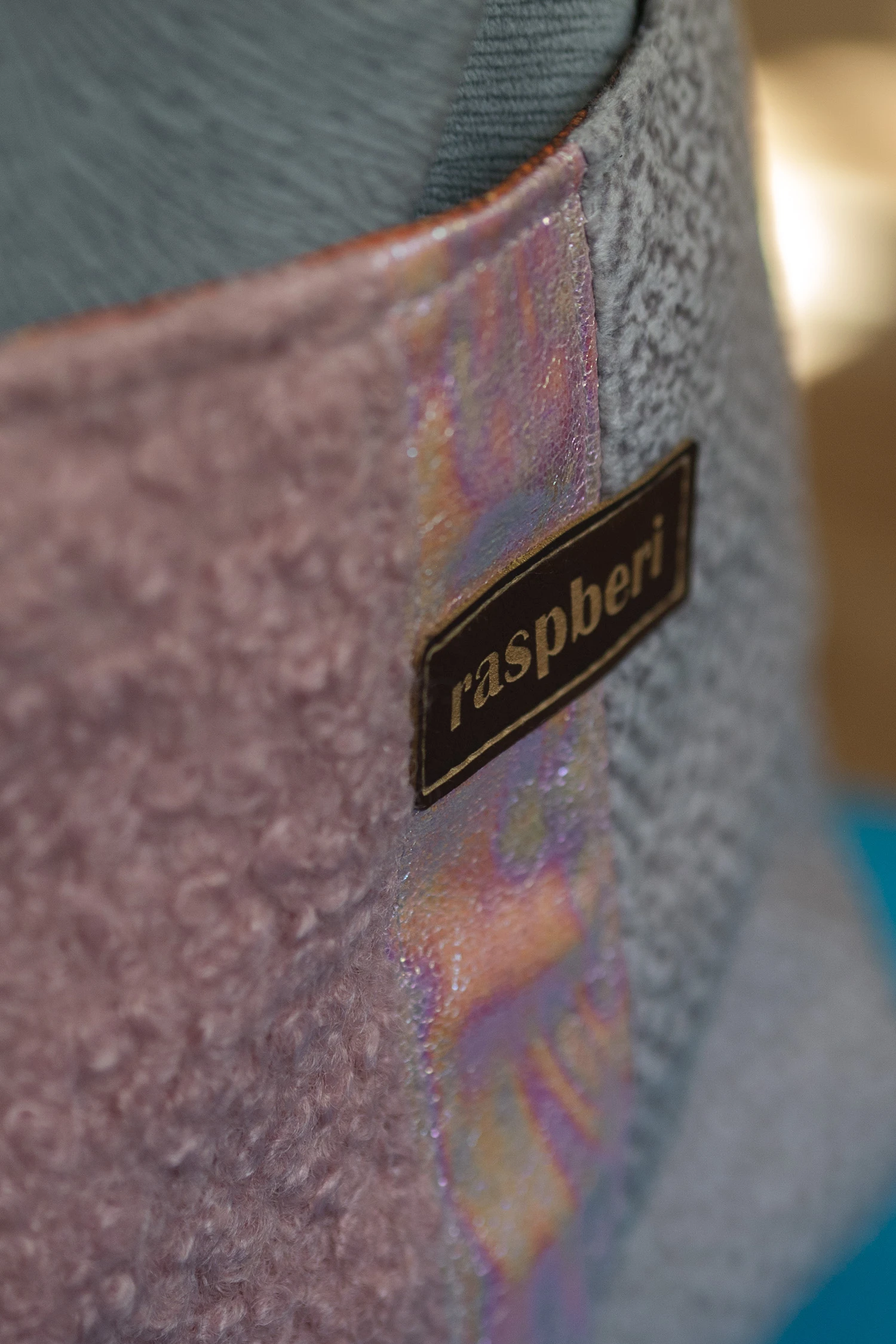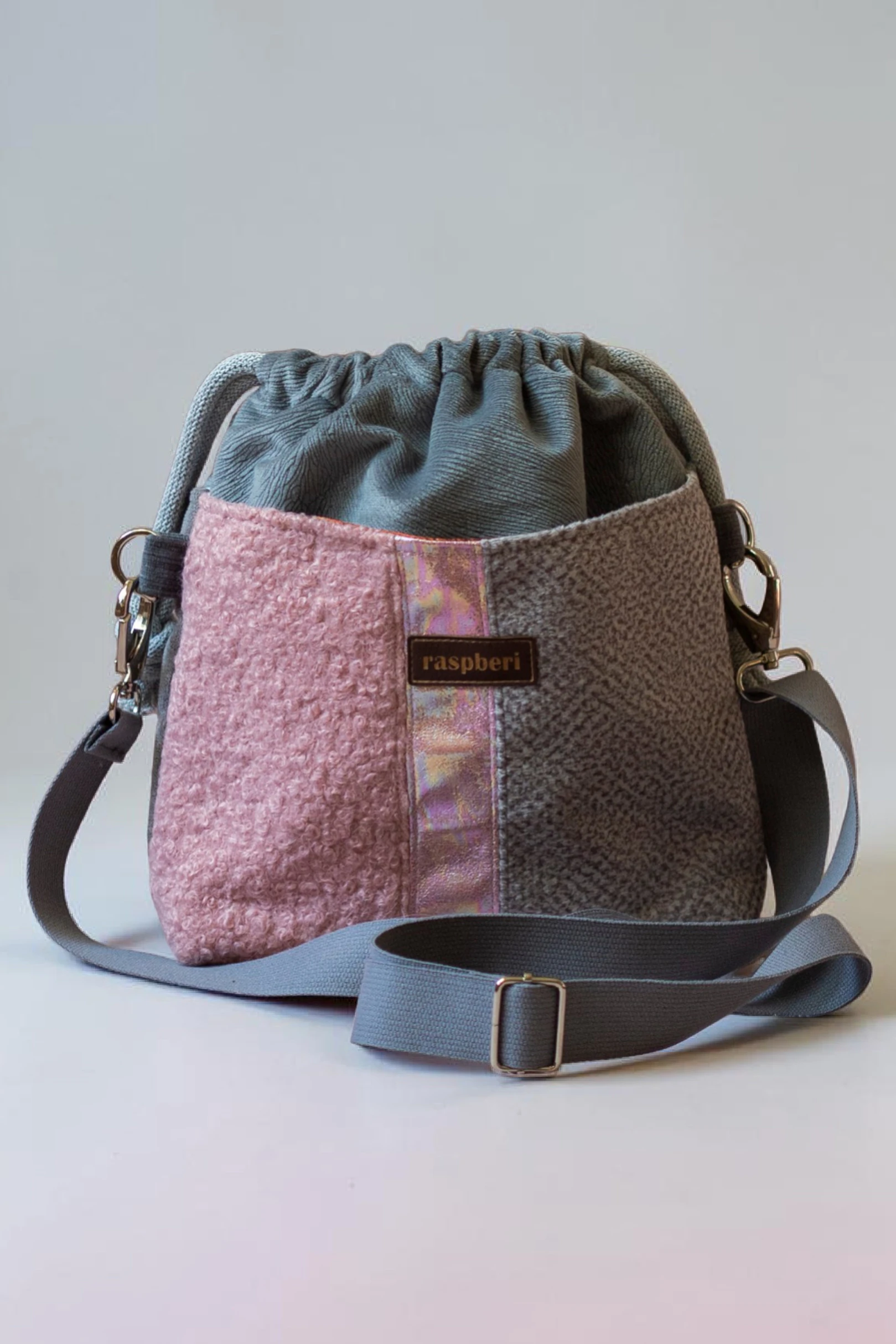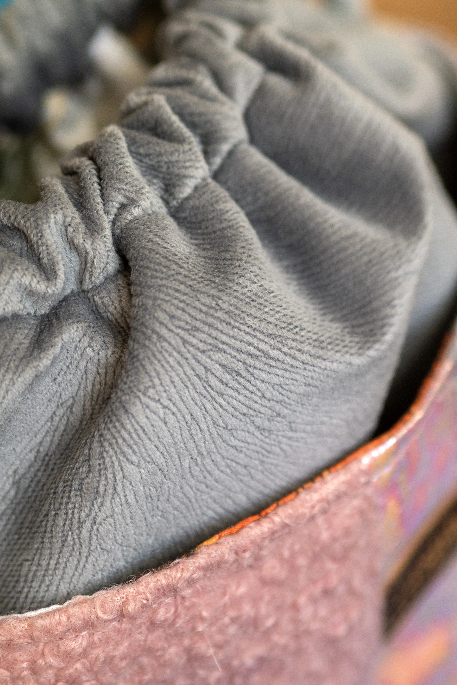 Wykonana z szarego weluru. Z przodu oraz z na tyle torebki kieszenie (np. na telefon czy chusteczki) z kilku rodzajów tkanin tworzących wspólnie ciekawą wizualnie całość. Stworzona w duchu no waste.