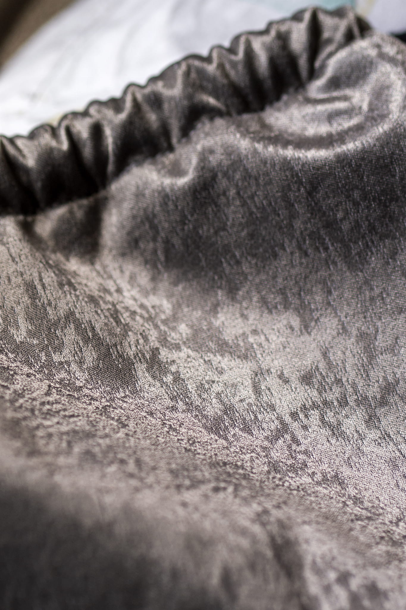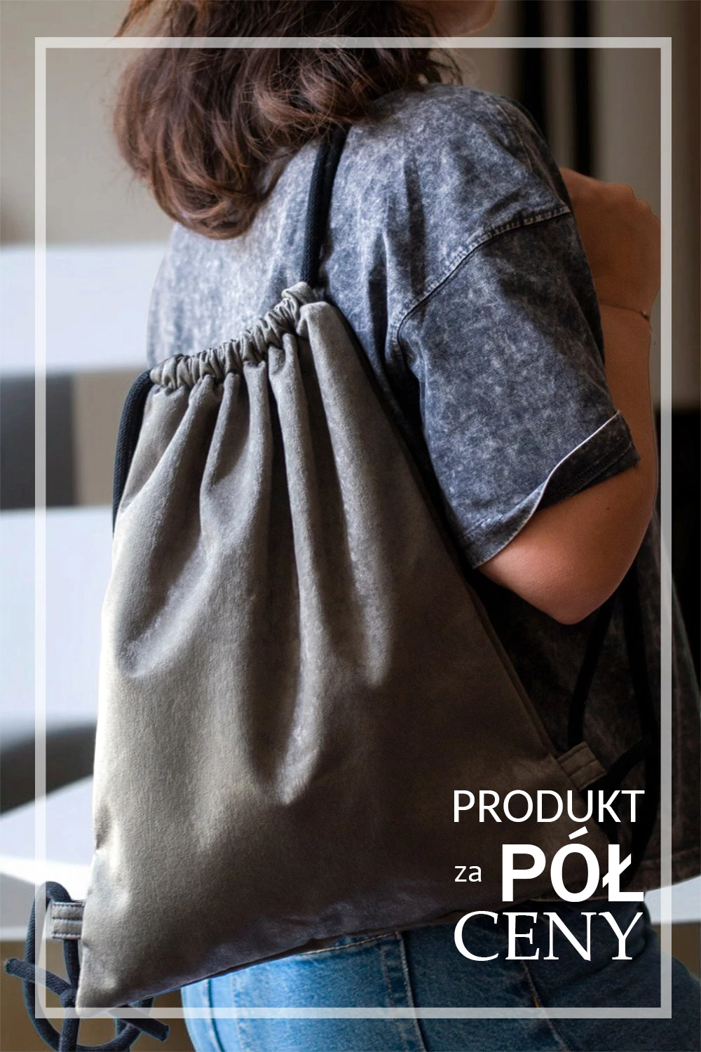 Plecak worek wykonany z szarej połyskującej tkaniny.
