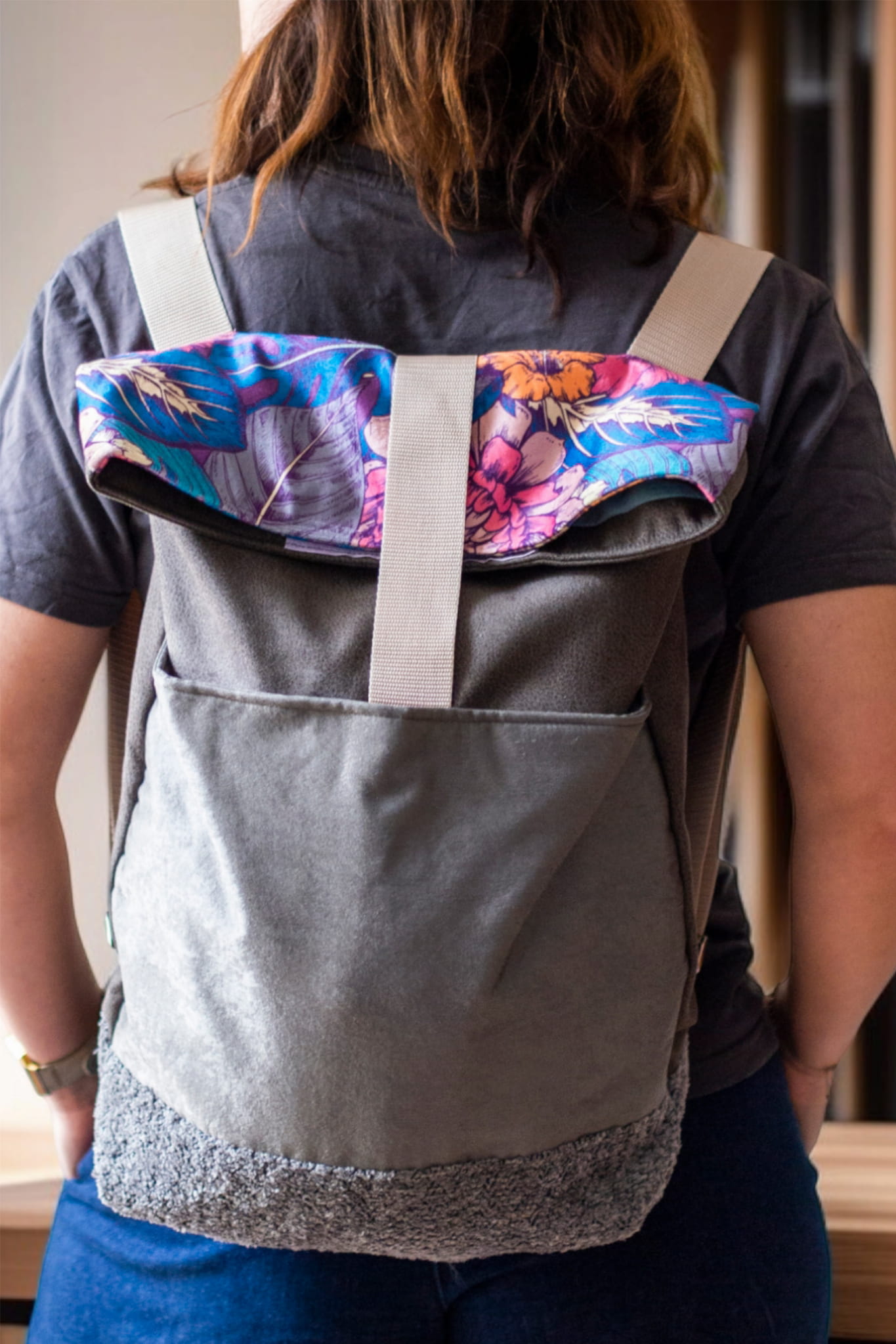Duży, damski plecak miejski składany i zapinany na rzep wykonany z kilku rodzajów tkanin.