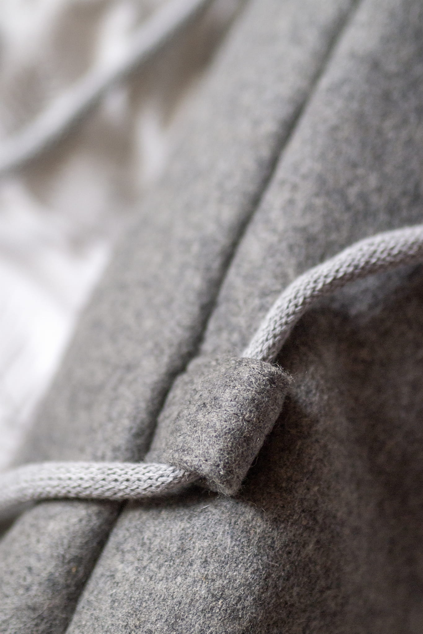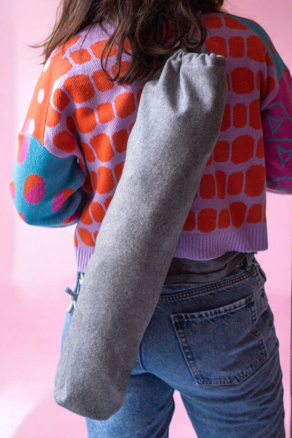 Plecak worek wykonany z szarego flauszu. Jego kształt sprawia, iż idealnie nadaje się na pokrowiec na matę do jogi.