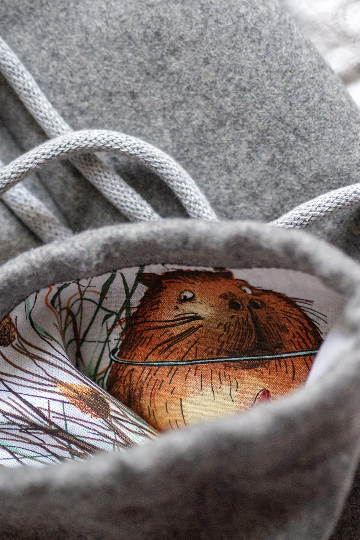 Biała, bawełniana podszewka w kapibary, okrągłe dno. Całości dopełnia gruby, bawełniany sznurek w kolorze jasnoszarym.