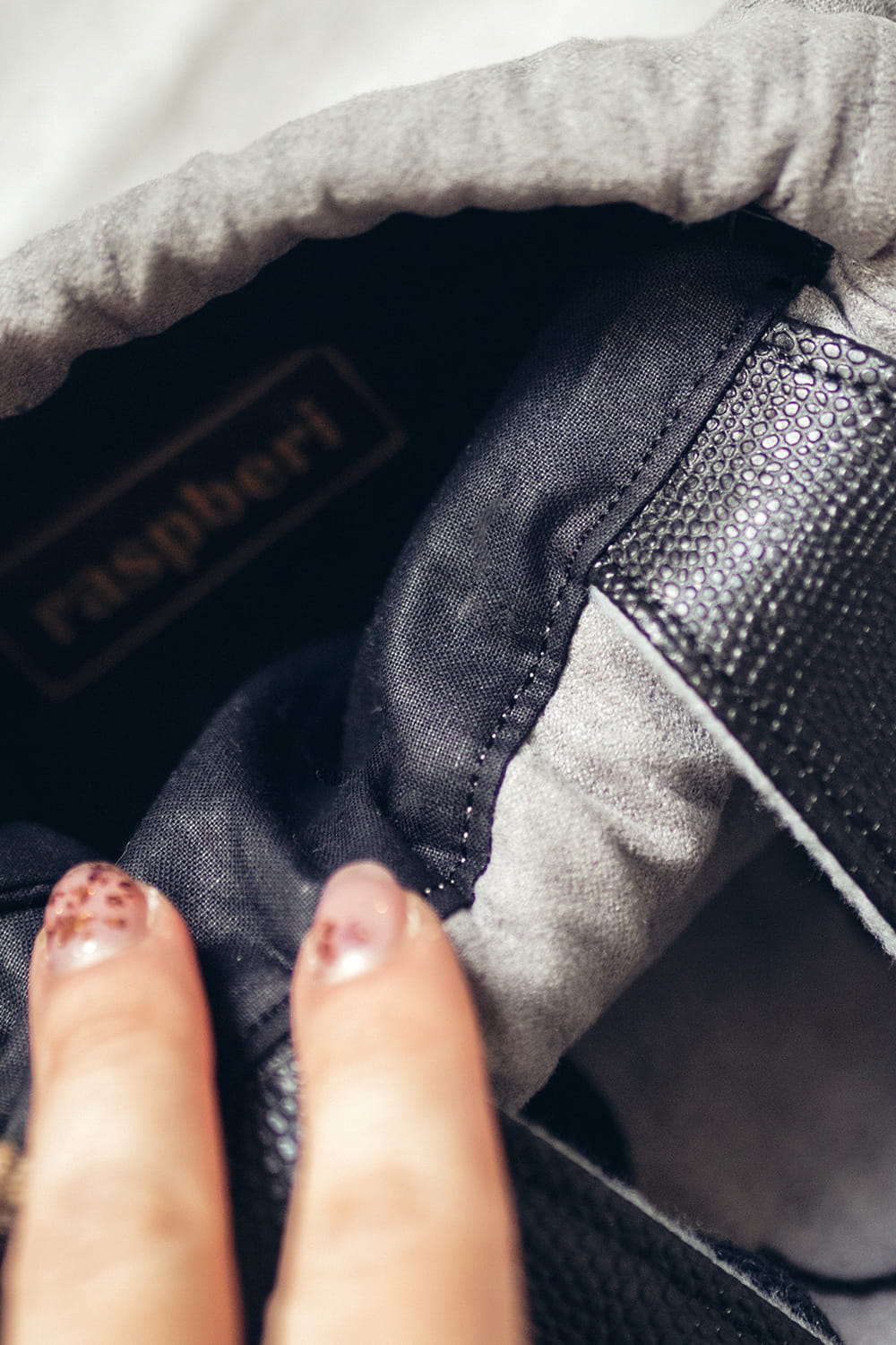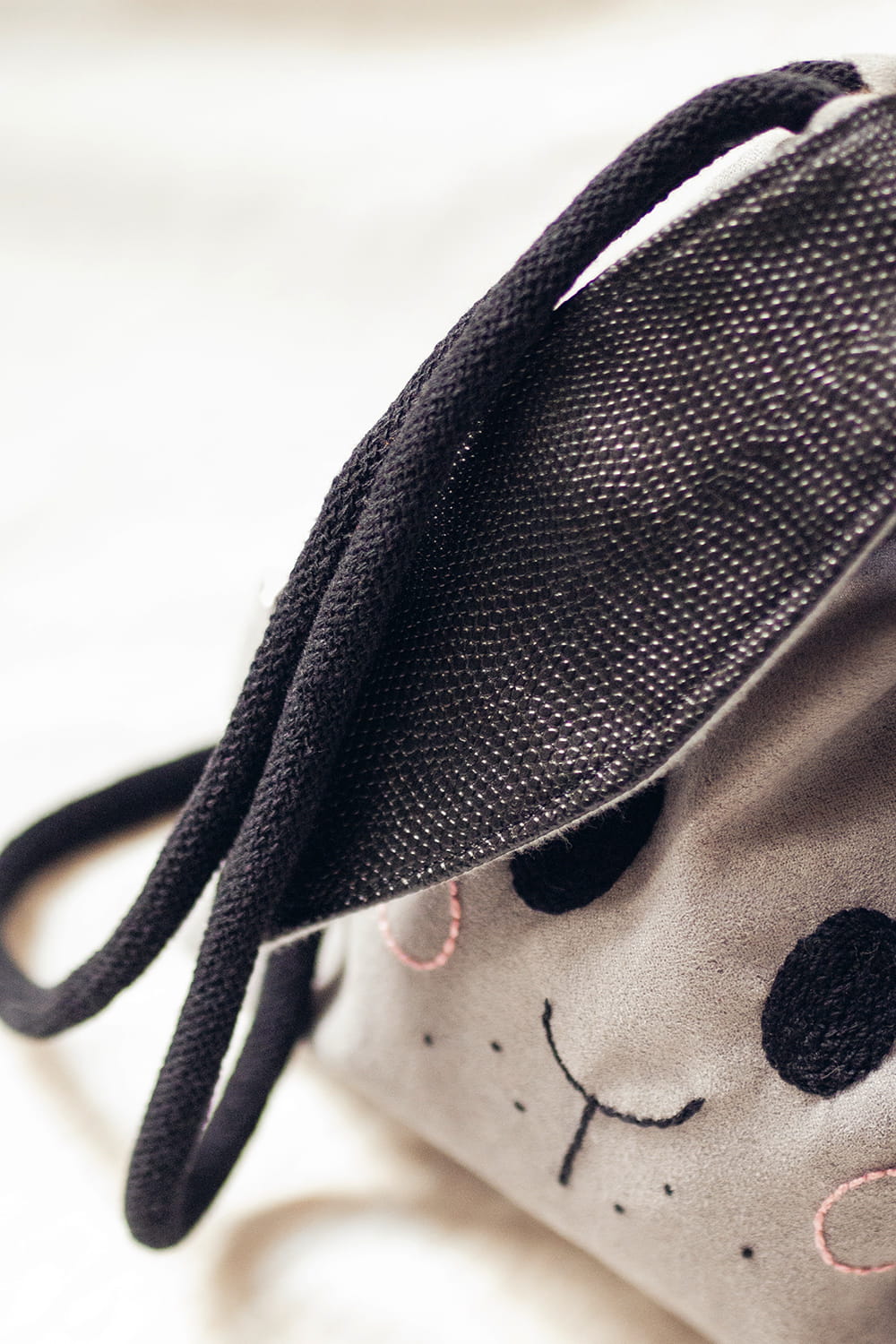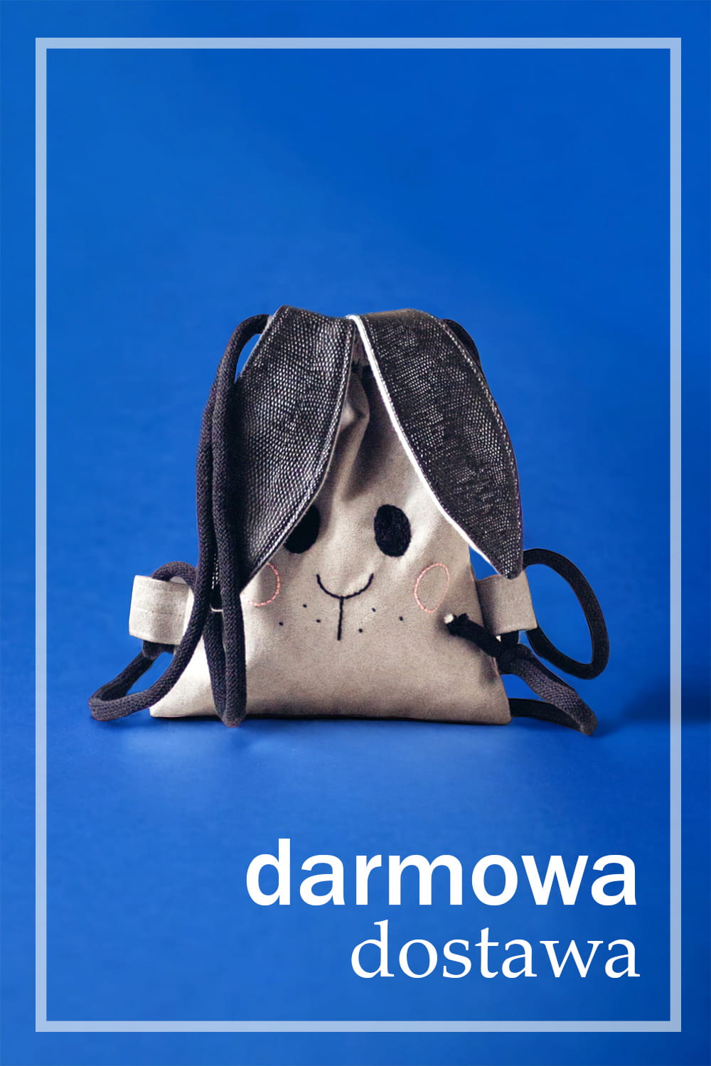 Dziecięcy plecaczek worek wykonany z szarego nubuku. Uszy królika z czarnej tłoczonej ekoskóry. Bawełniane sznurki w kolorze czarnym.