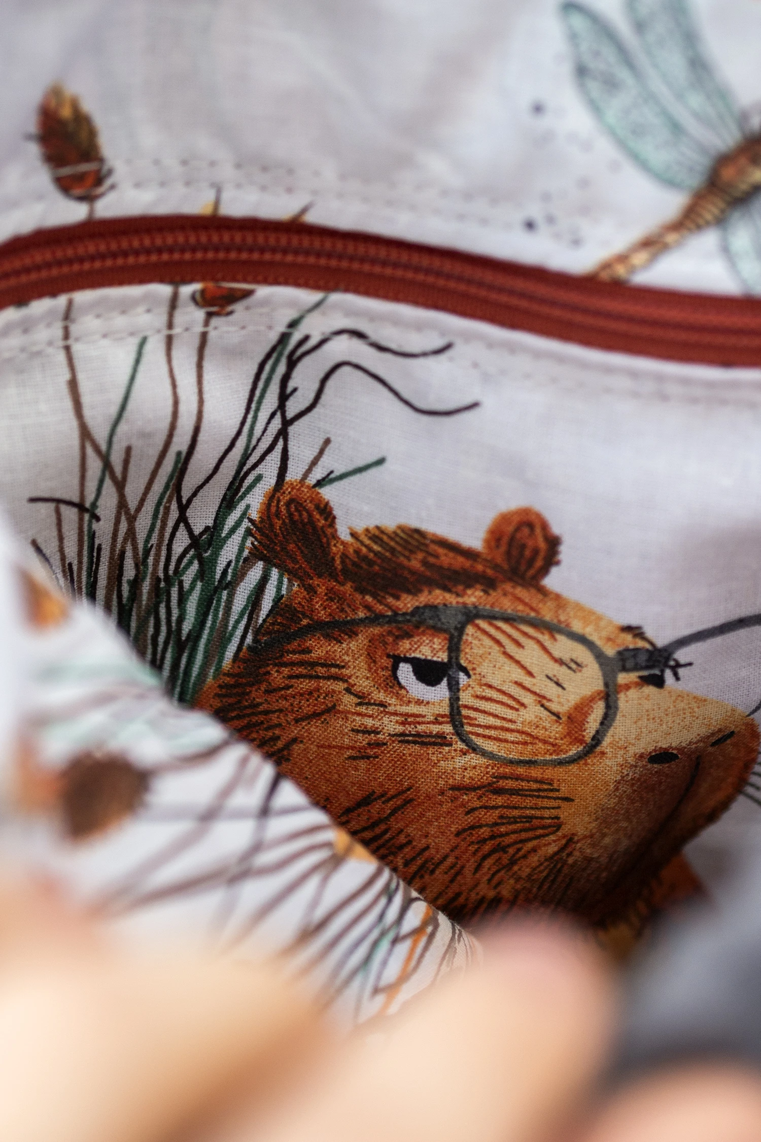 Środek plecaka wykończony jest bawełnianą podszewką w kapibary.