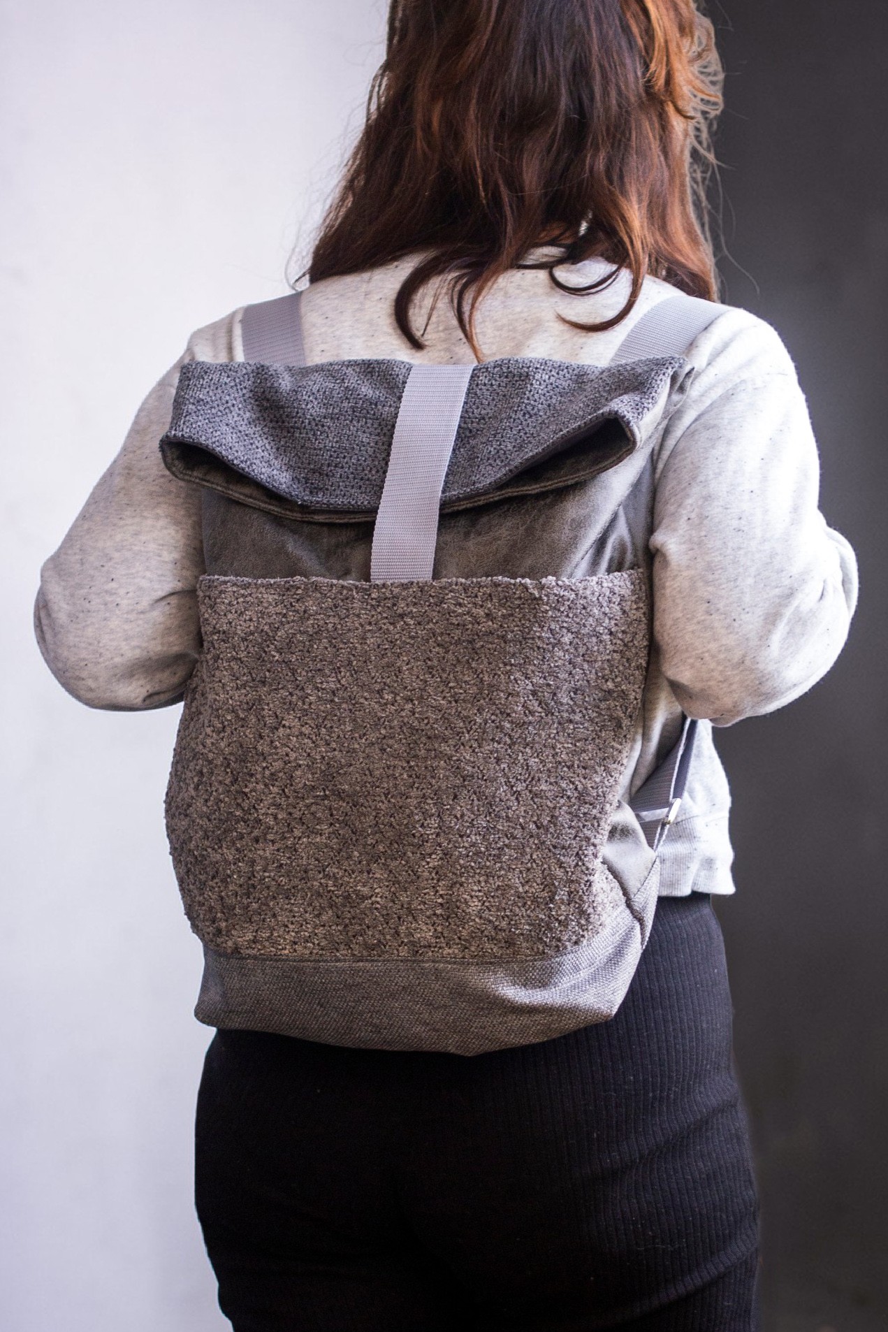Duży plecak miejski składany i zapinany na rzep wykonany z kilku rodzajów tkanin.