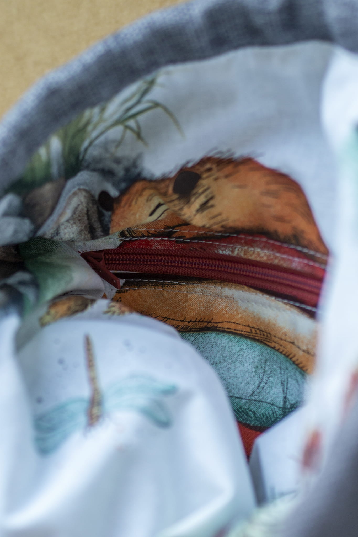 W środku plecak posiada kieszeń zapinaną na suwak. Wykończony jest bawełnianą podszewkę w kapibary.