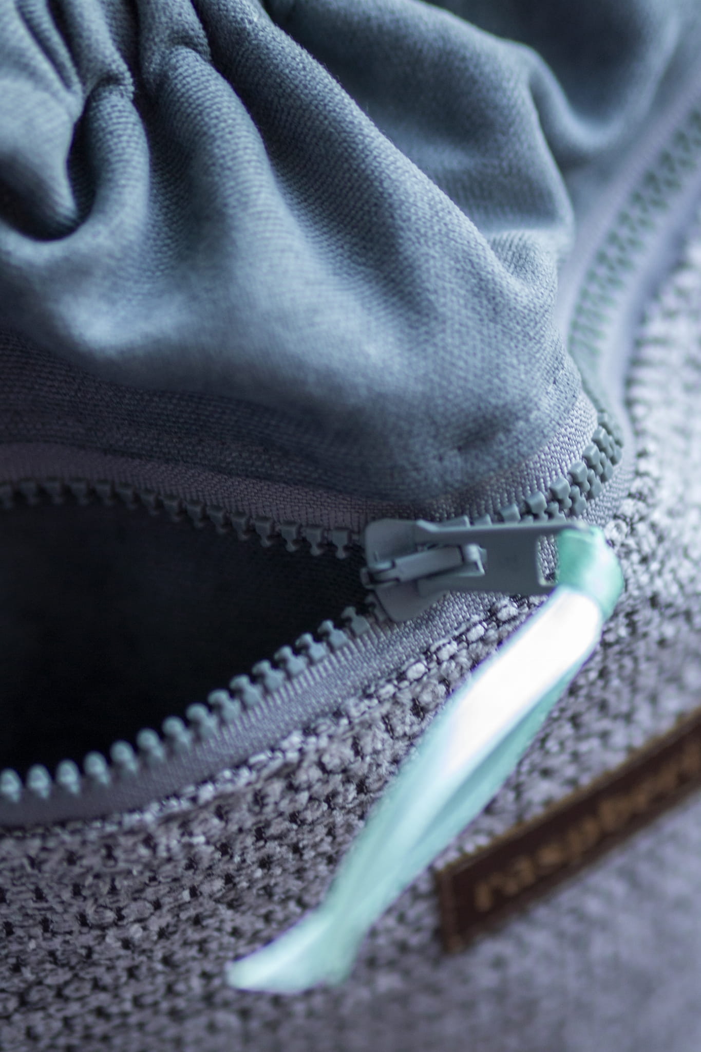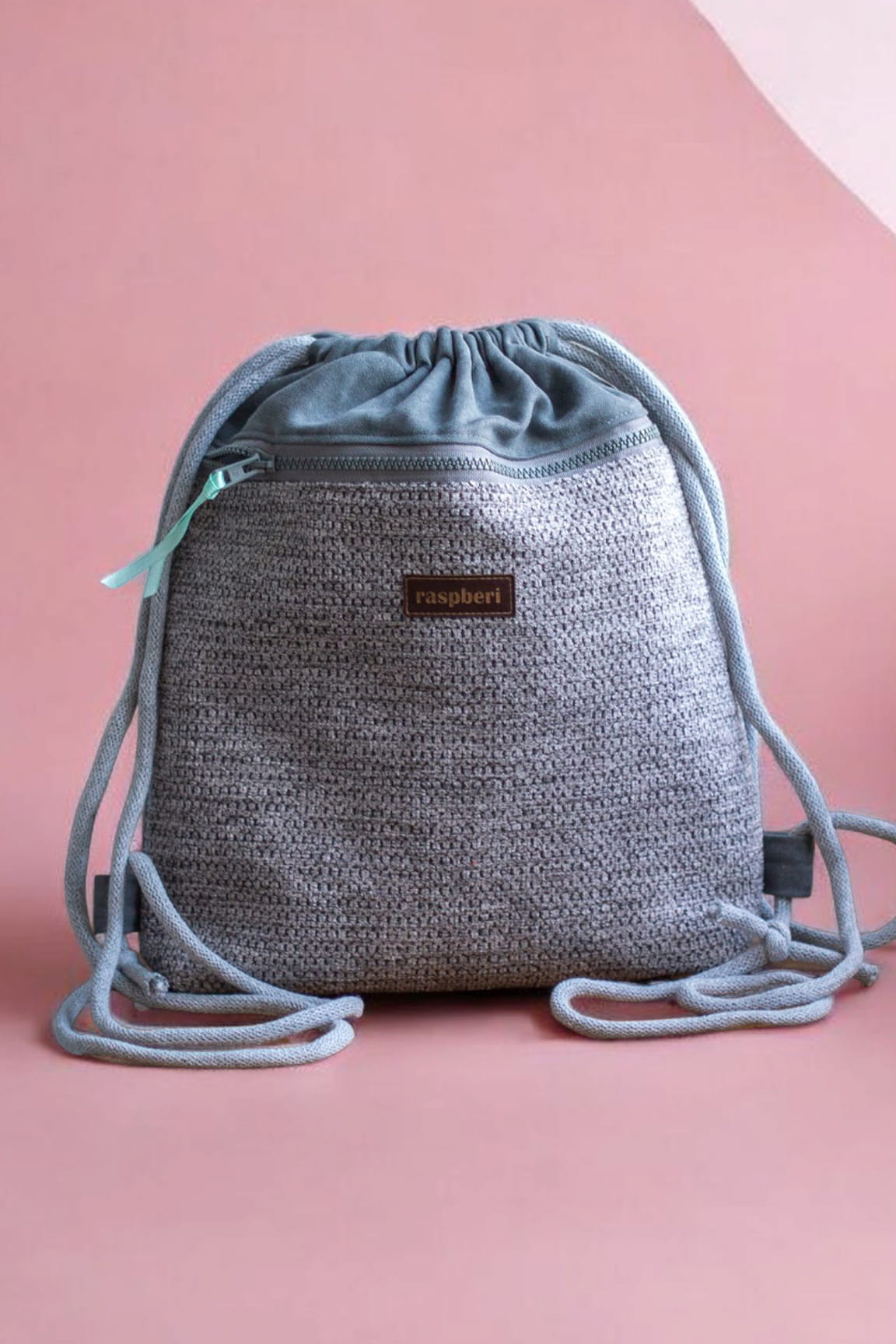 Plecak worek wykonany z szarej tkaniny. Z przodu duża kieszeń zapinana na suwak z ciemnej plecionki. Z tyłu plecaka (z boku, na dole) mała zapinana kieszonka.