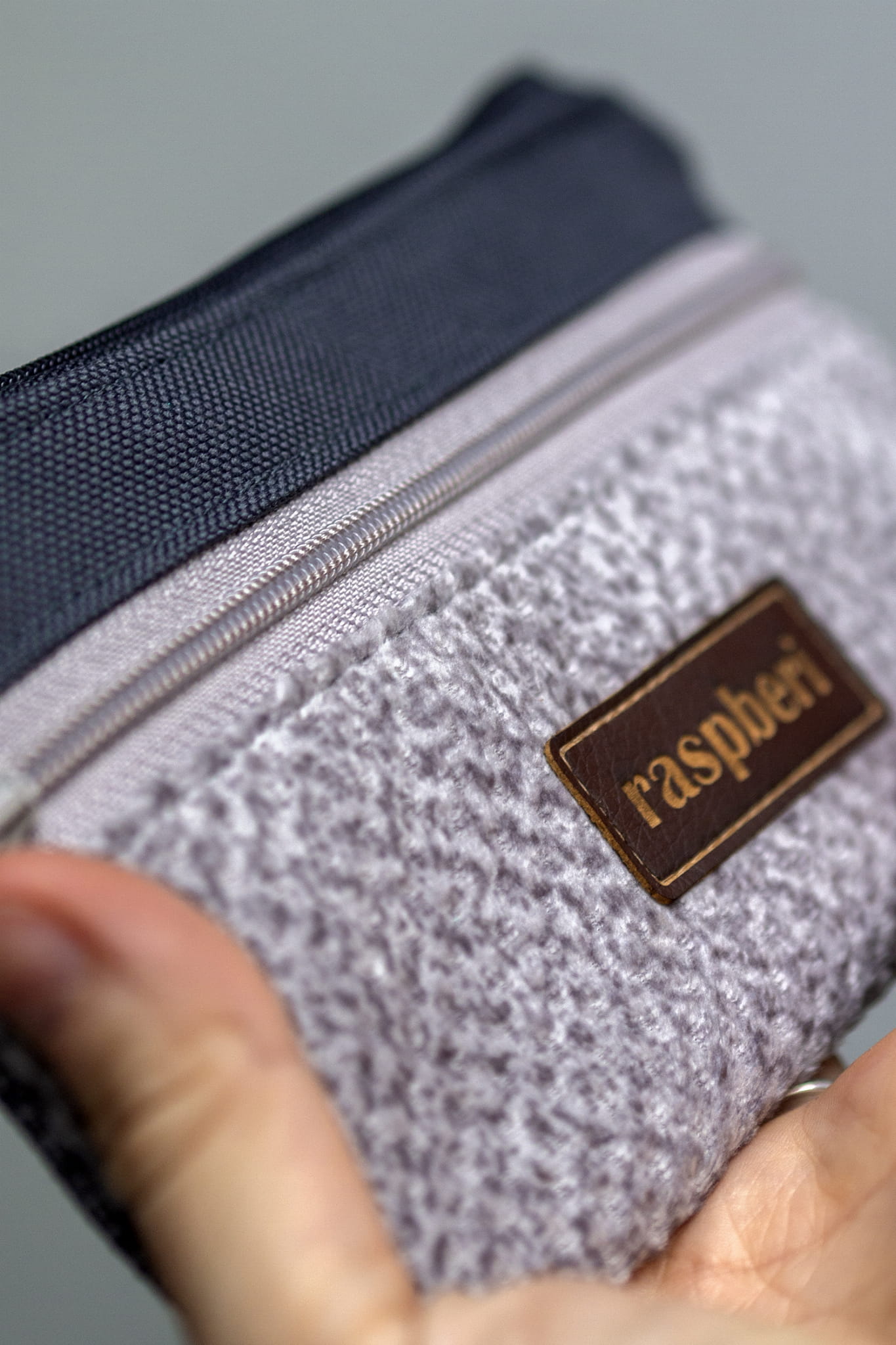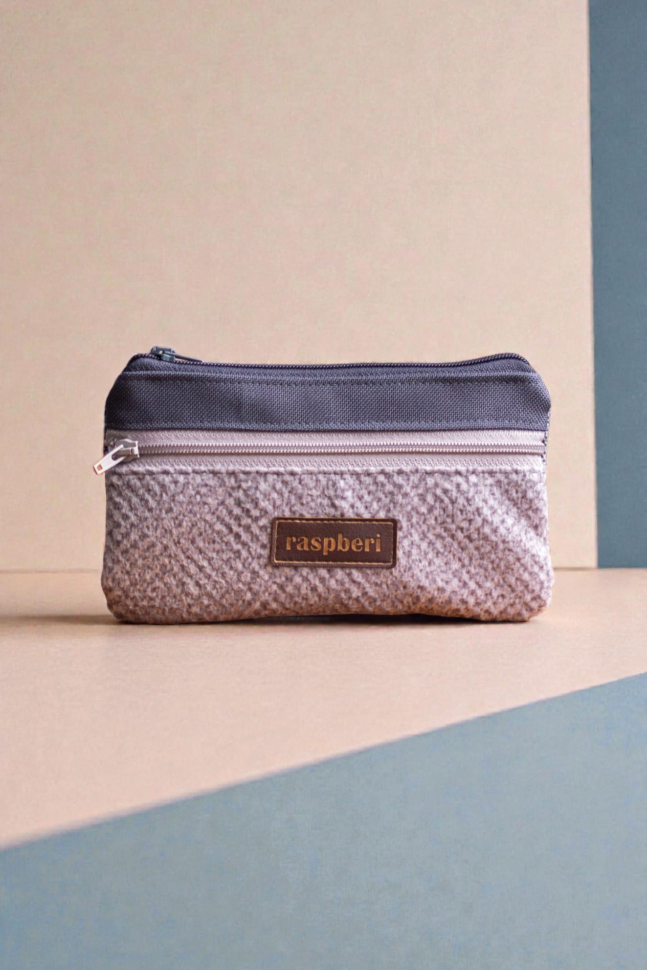 Prosty wodoodporny portfel wykonany z kilku rodzajów tkanin w odcieniach szarości.