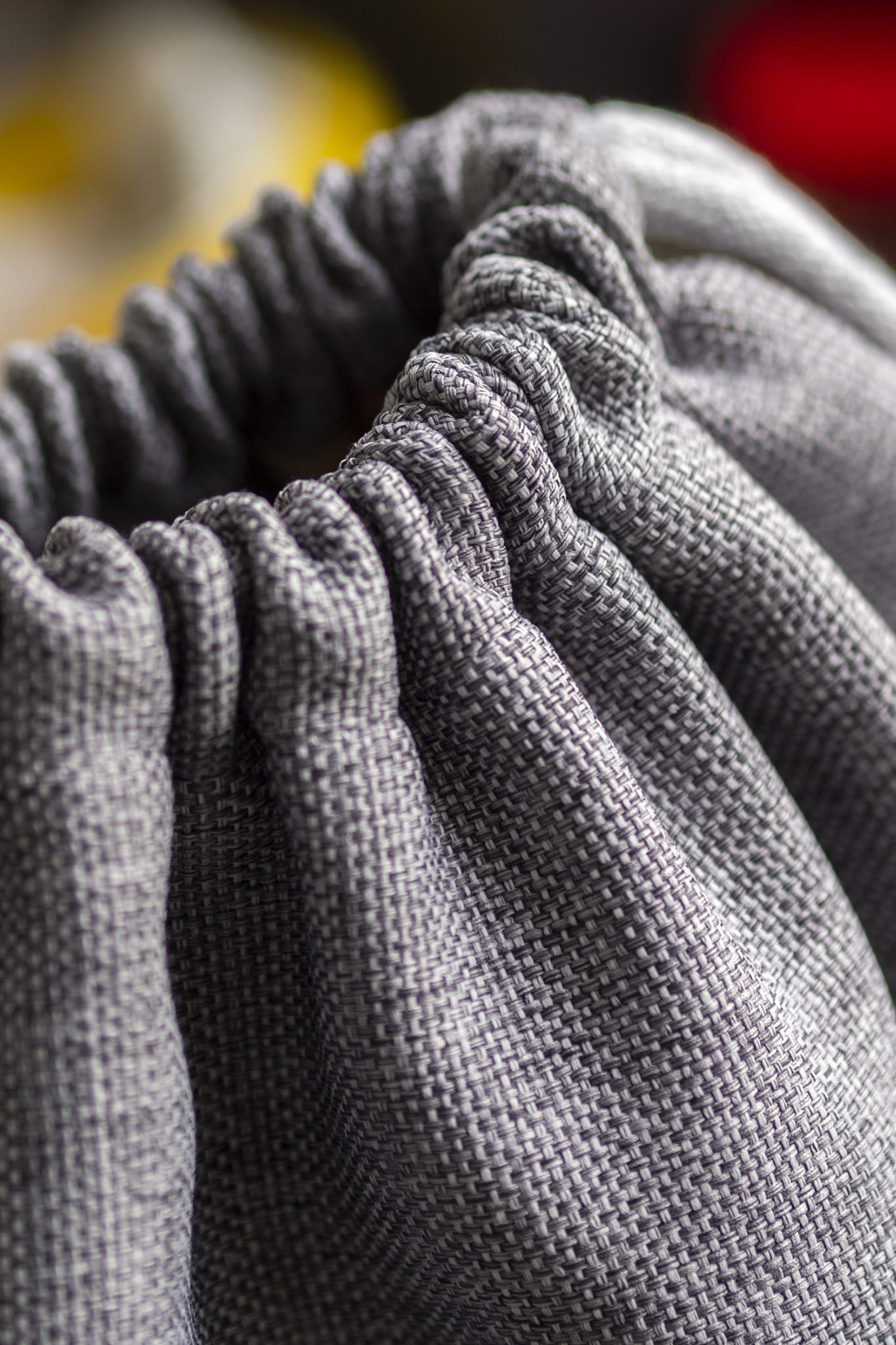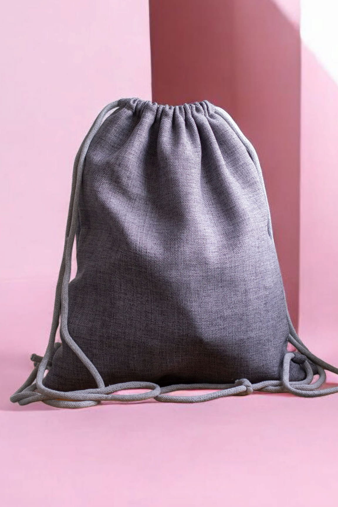 Plecak worek wykonany z szarej tkaniny o widocznym splocie.