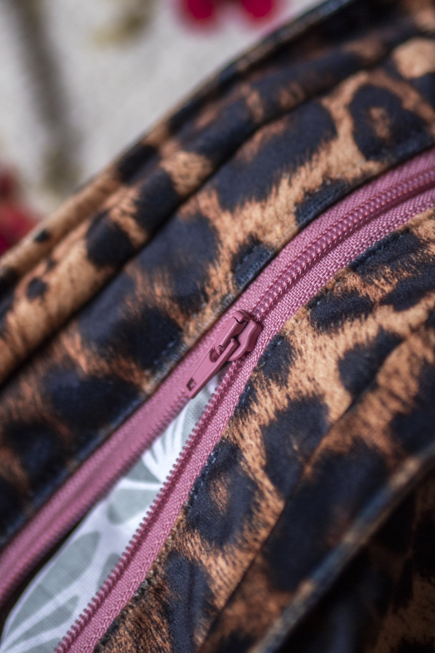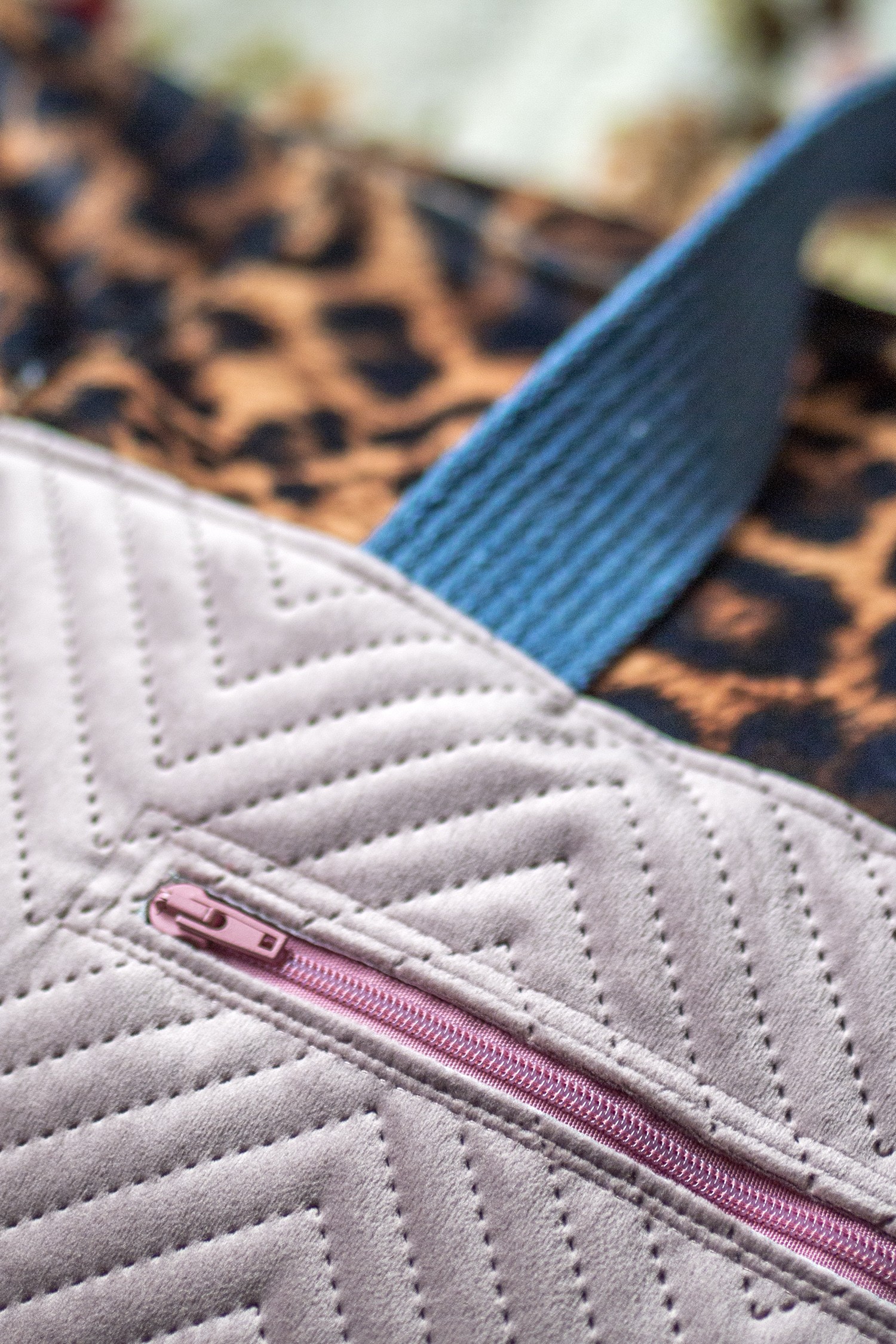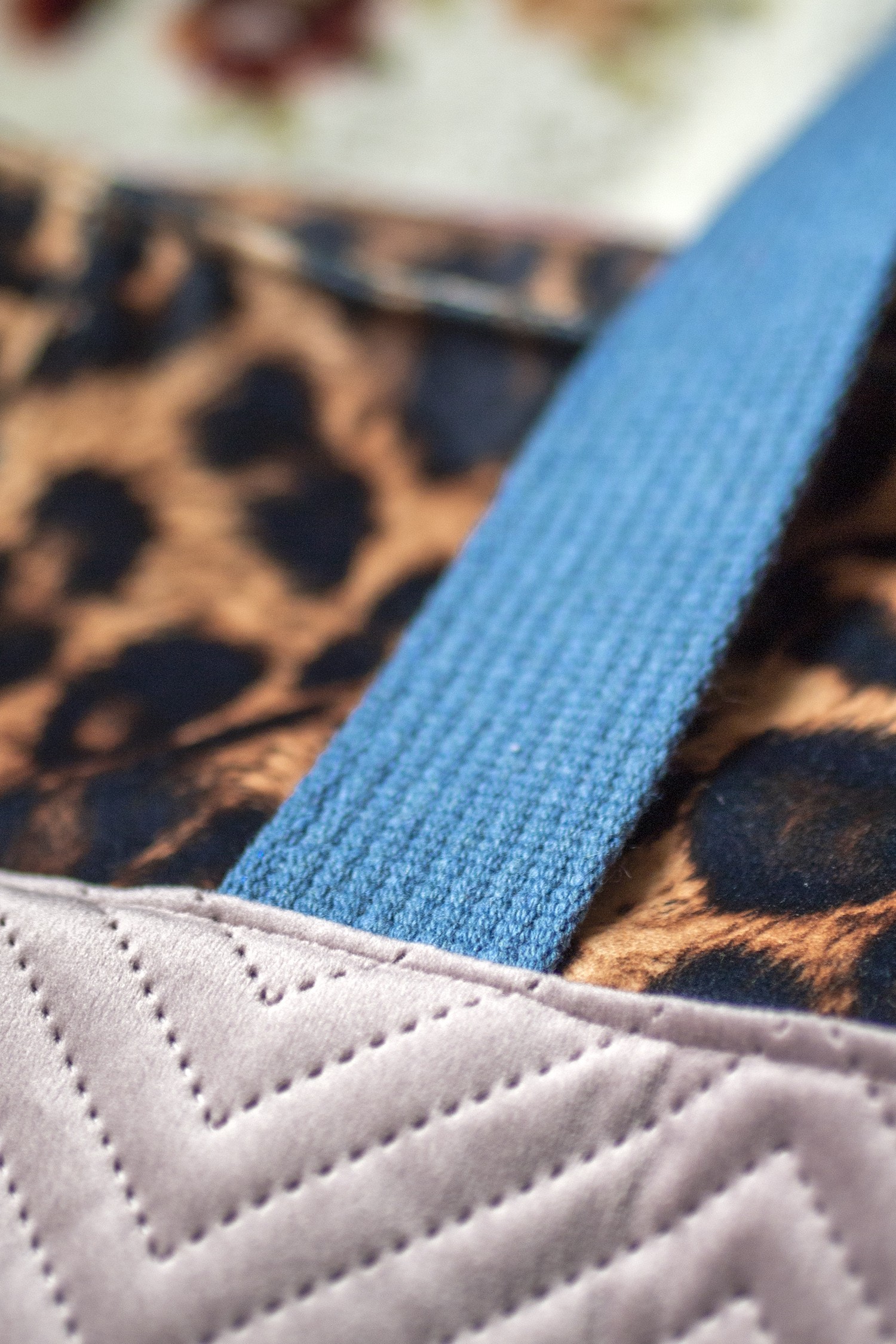 Torba uszyta jest z weluru w panterkę w połączeniu z pudrowym pikowanym welurem, pudrowym grubym sztruksem i welurem w kolorze beżowym.
