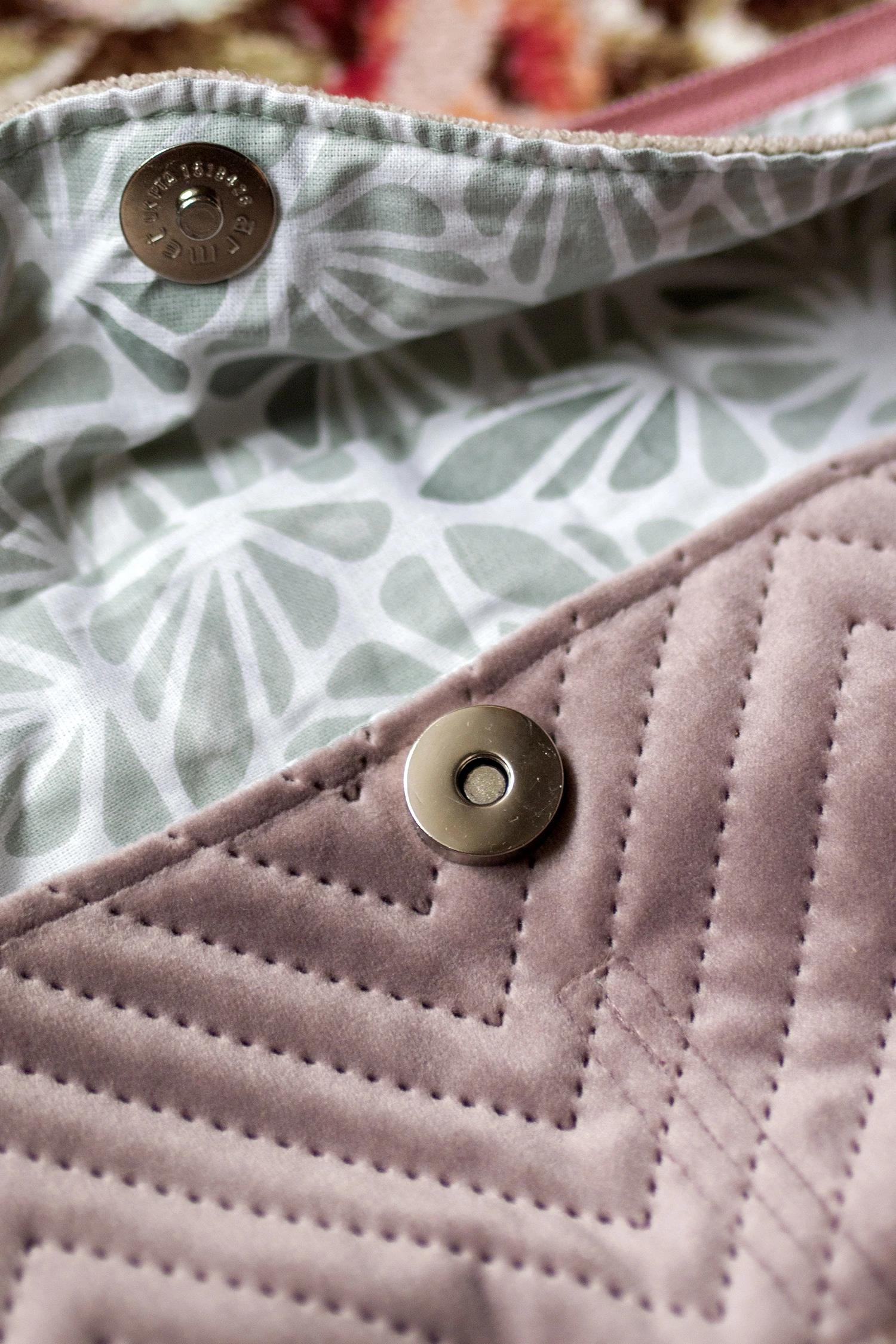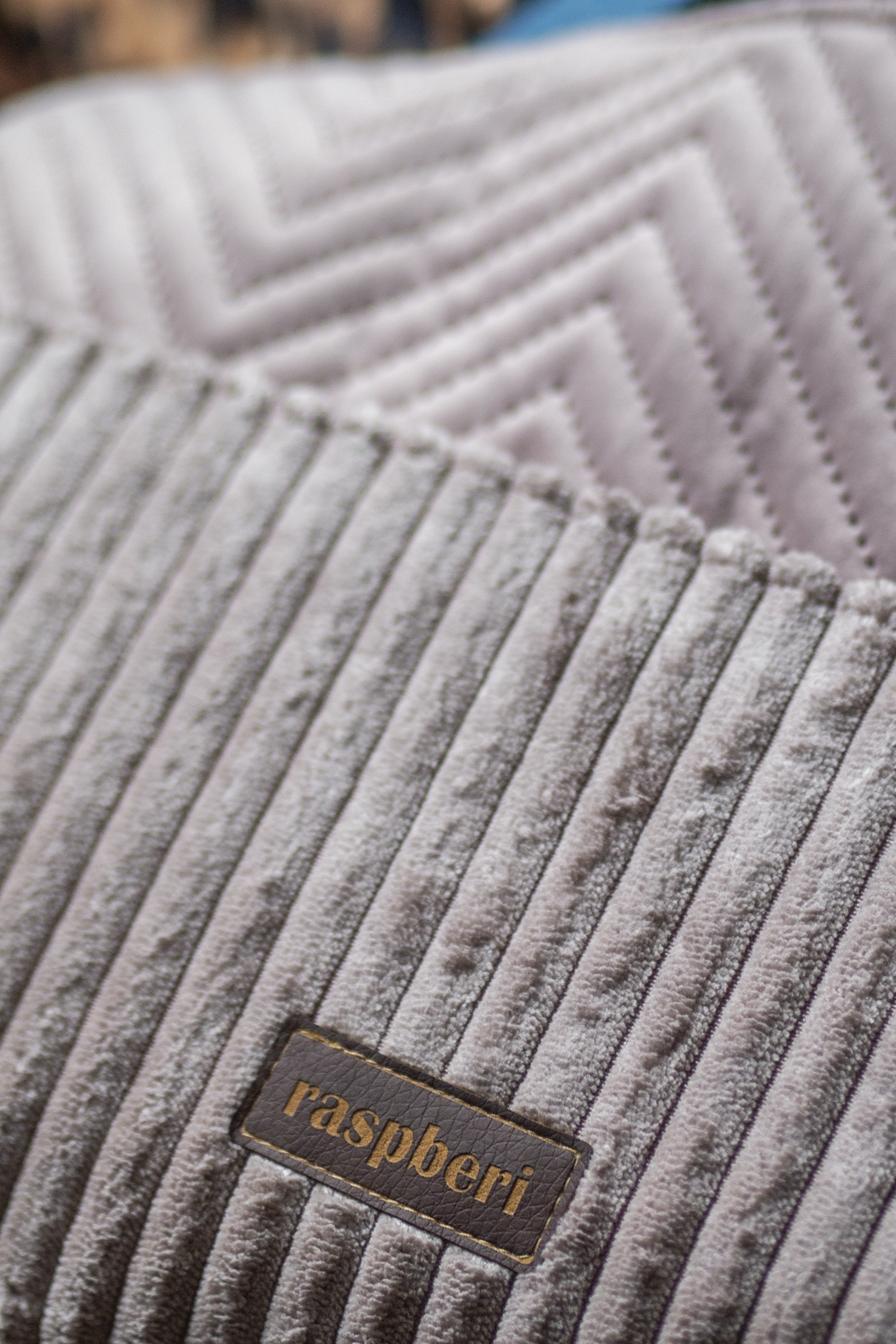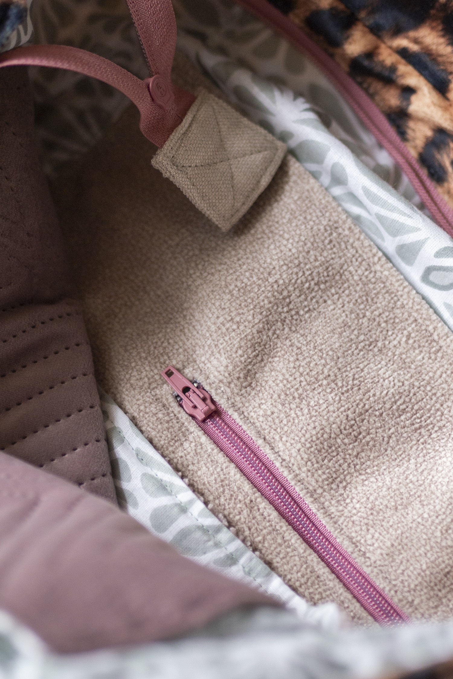 Torba uszyta jest z weluru w panterkę w połączeniu z pudrowym pikowanym welurem, pudrowym grubym sztruksem i welurem w kolorze beżowym.