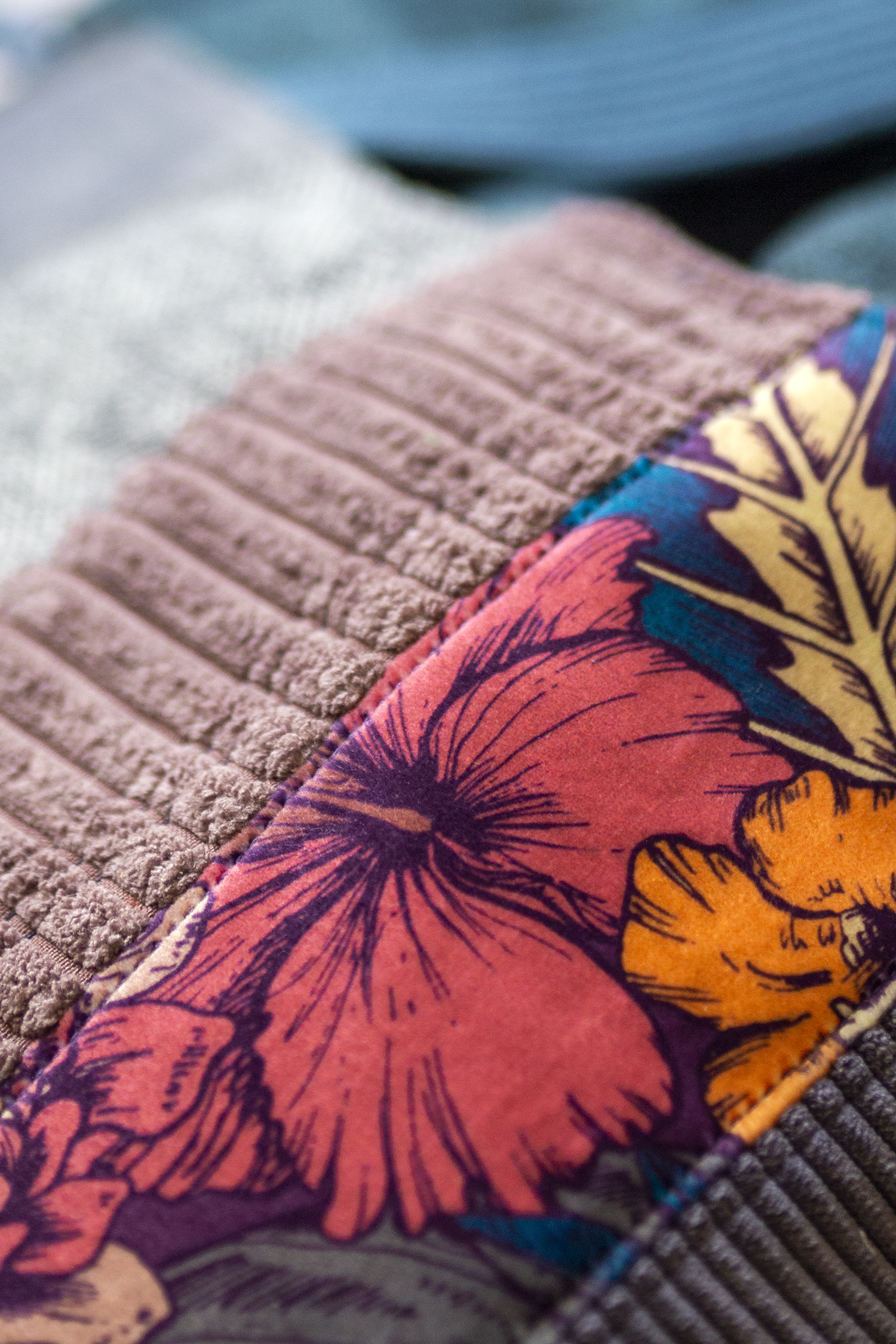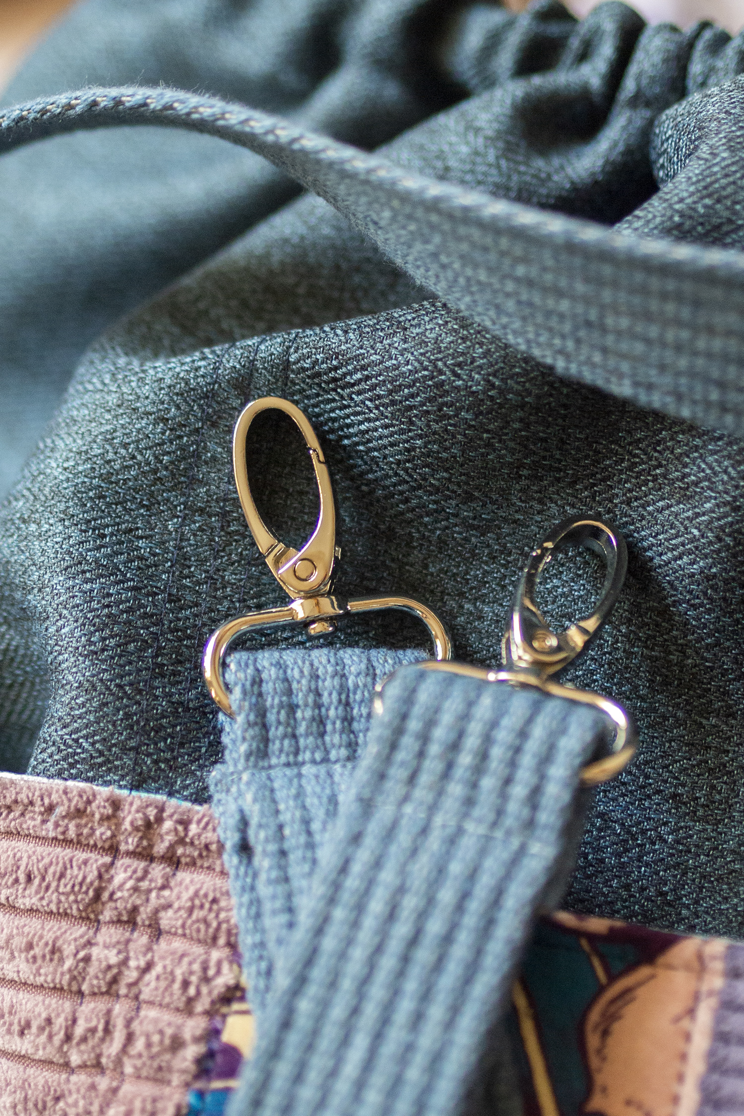 Torba worek wykonana z kilku rodzajów tkanin. Stworzona w duchu no waste.