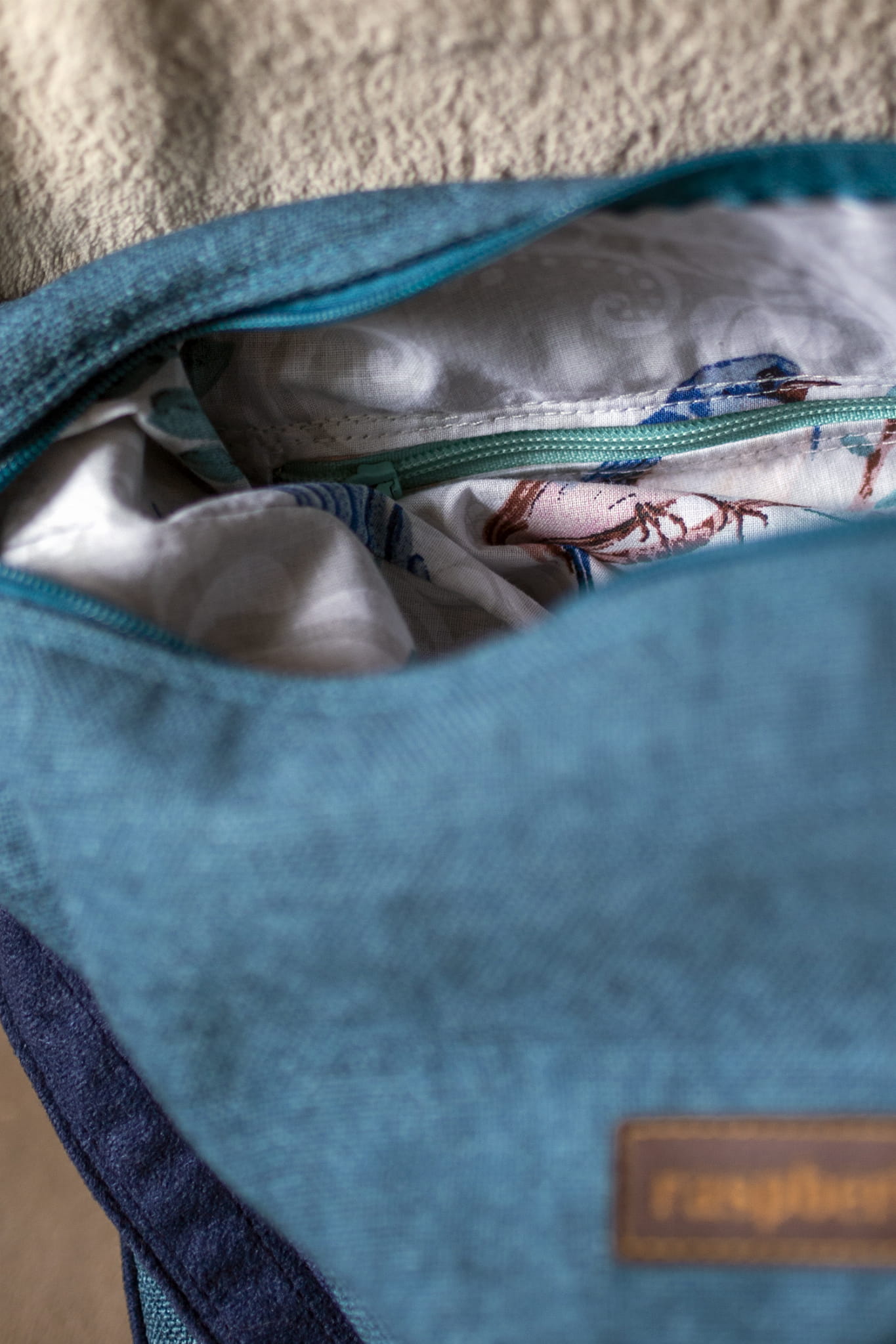 Średniej wielkości torebka w stylu boho. Worek zapinany na suwak z okrągłym, usztywnianym dnem wykonany z turkusowej tkaniny oraz miodowego weluru. Granatowe paski.