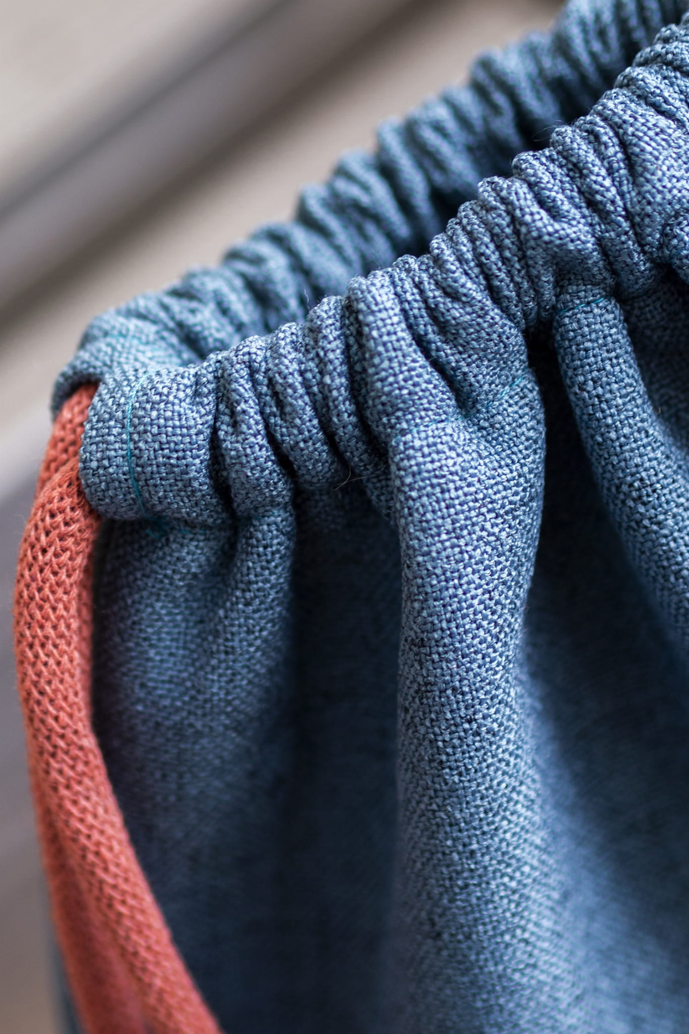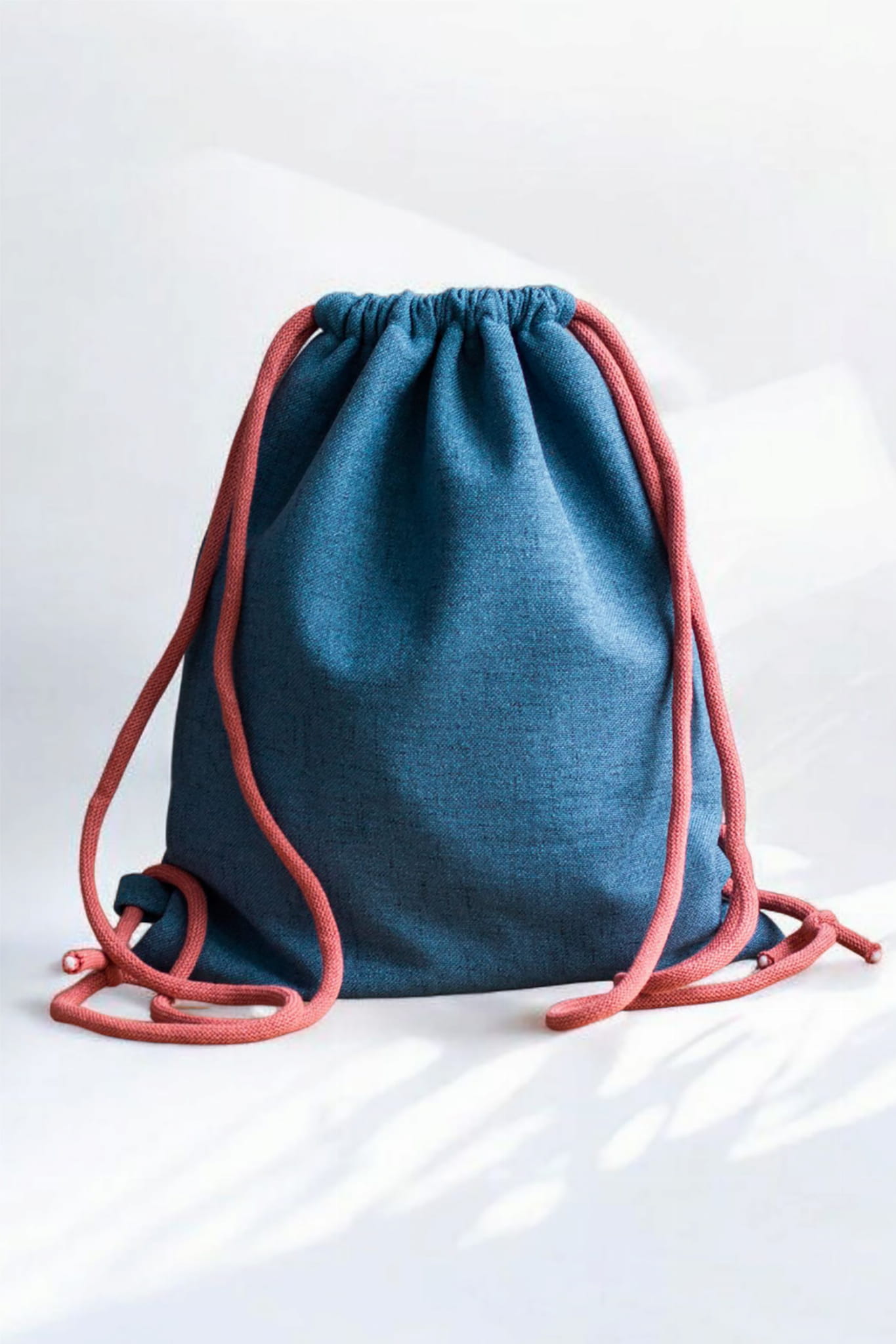 Plecak worek wykonany z plecionej tkaniny w kolorze turkusowym.