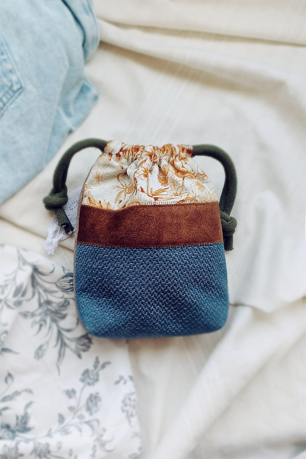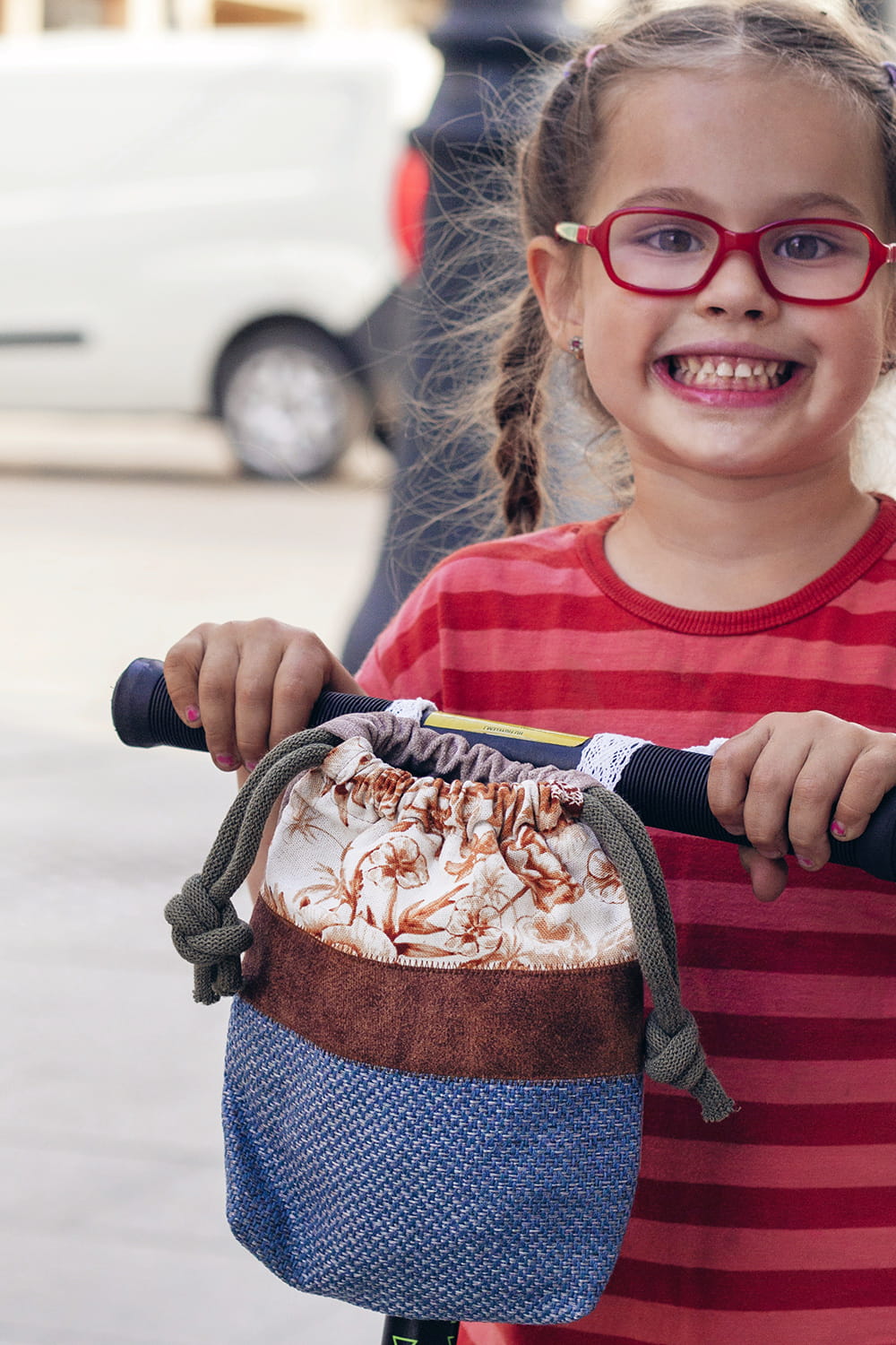 Mały woreczek z wykonany z kilku rodzajów tkanin ze specjalnymi uchwytami, dzięki którym można zamocować go na kierownicy ulubionego pojazdu malucha - roweru lub hulajnogi.