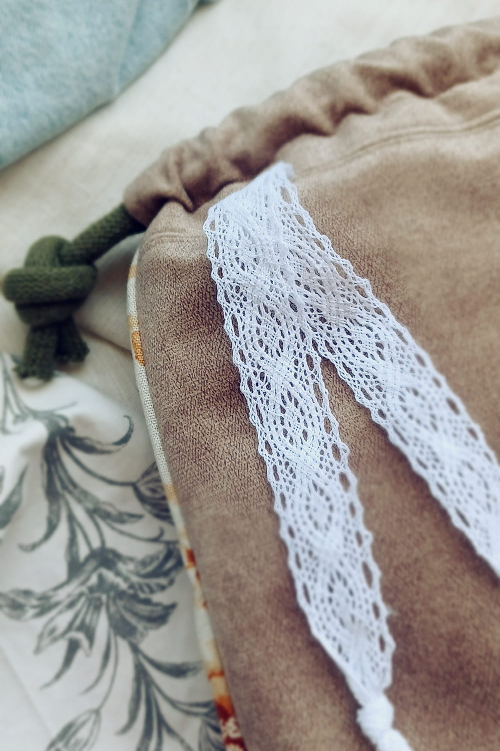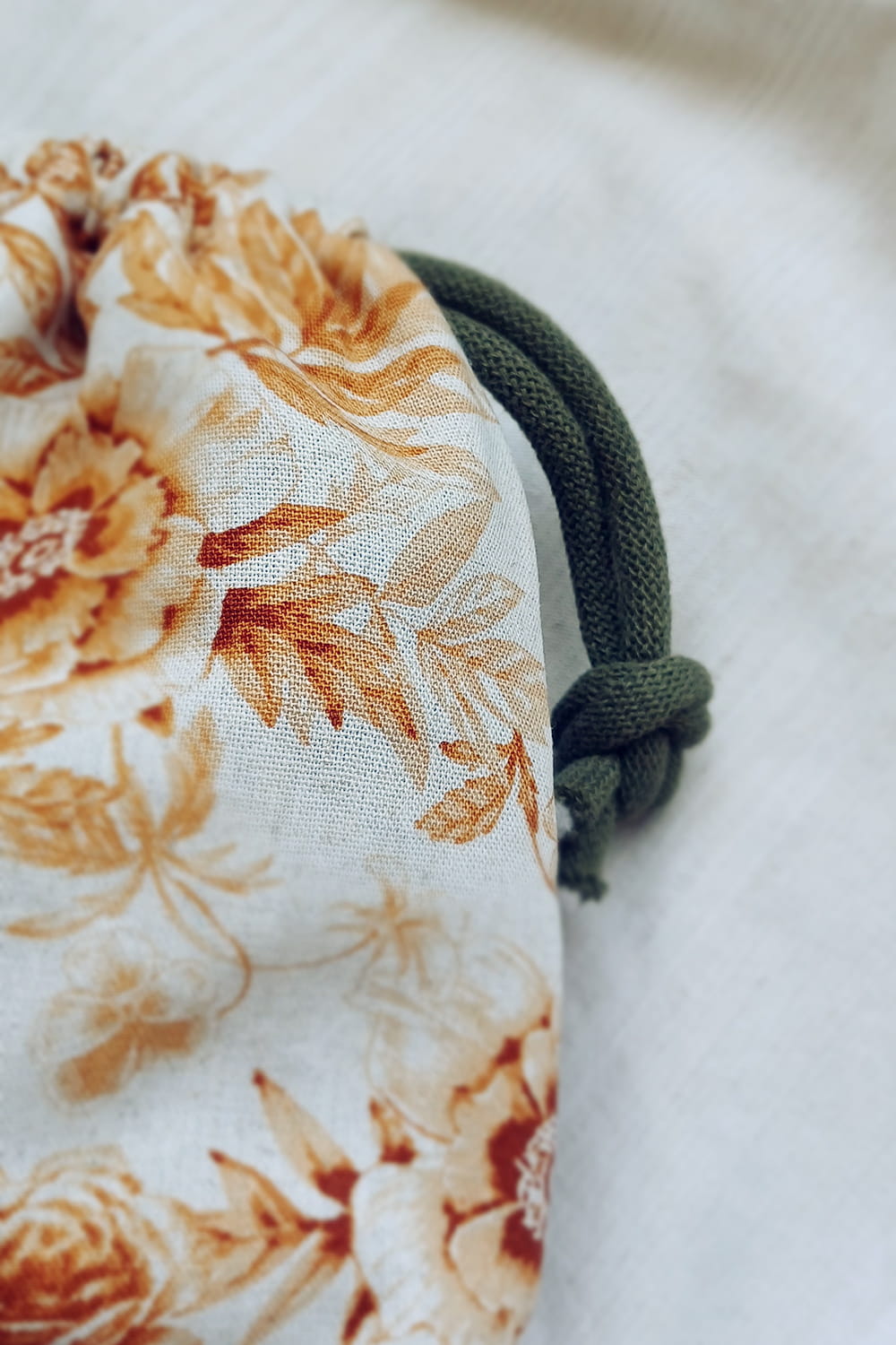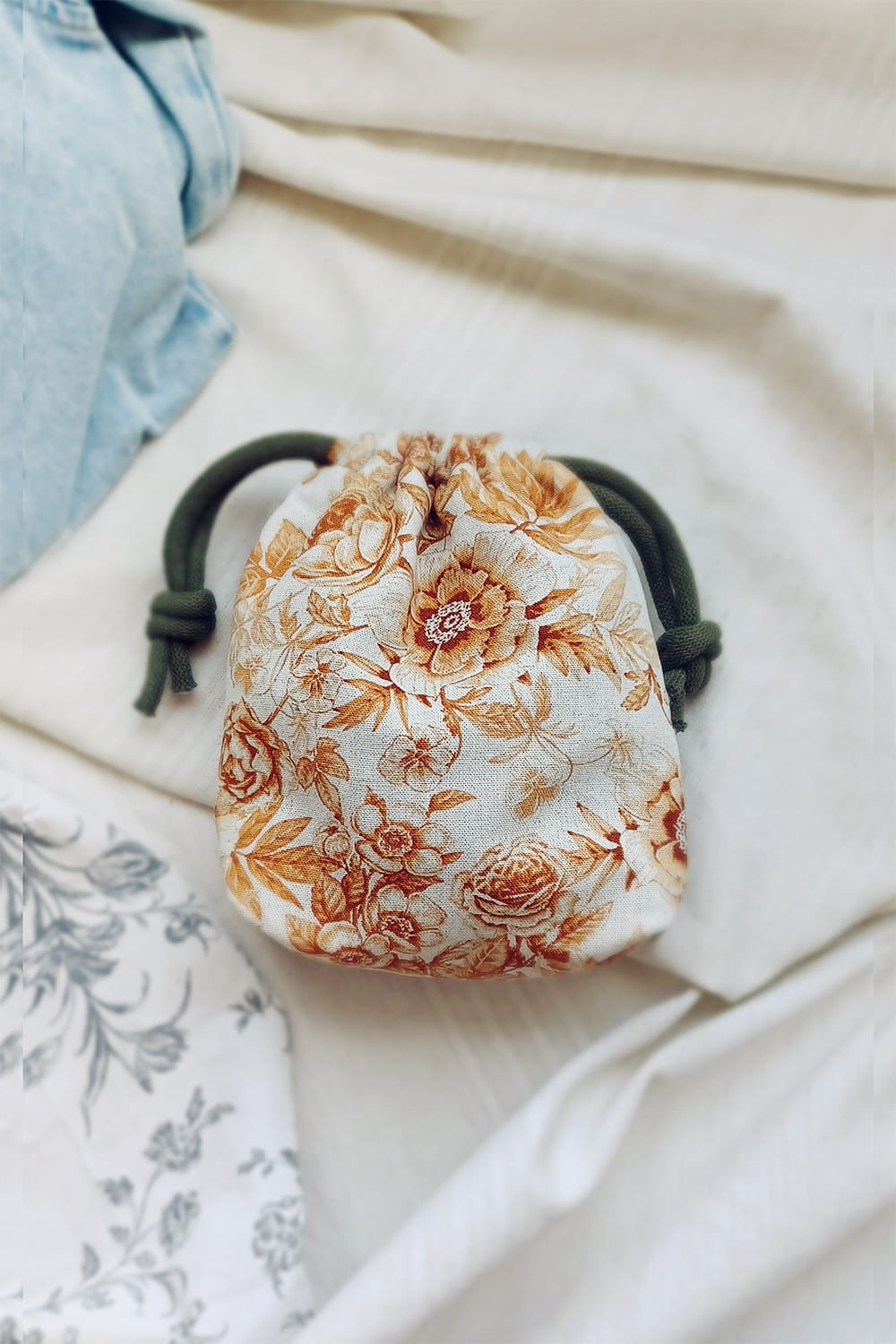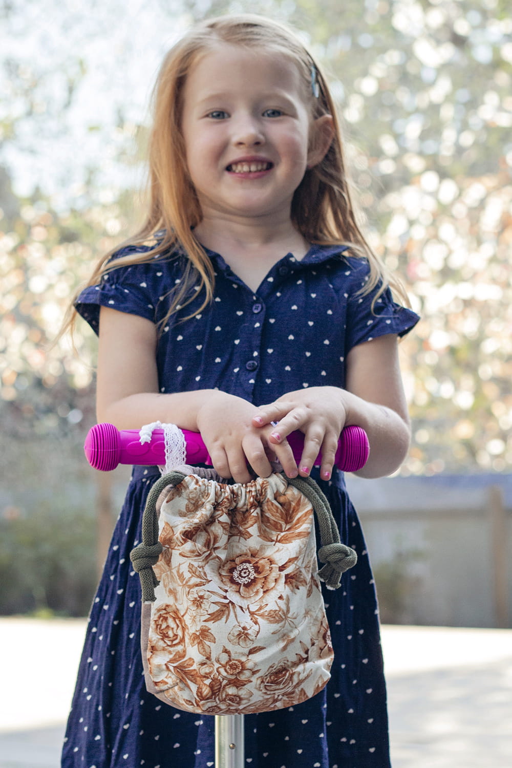 Mały woreczek z wykonany z tkaniny w rude kwiaty ze specjalnymi uchwytami, dzięki którym można zamocować go na kierownicy ulubionego pojazdu malucha - roweru lub hulajnogi.