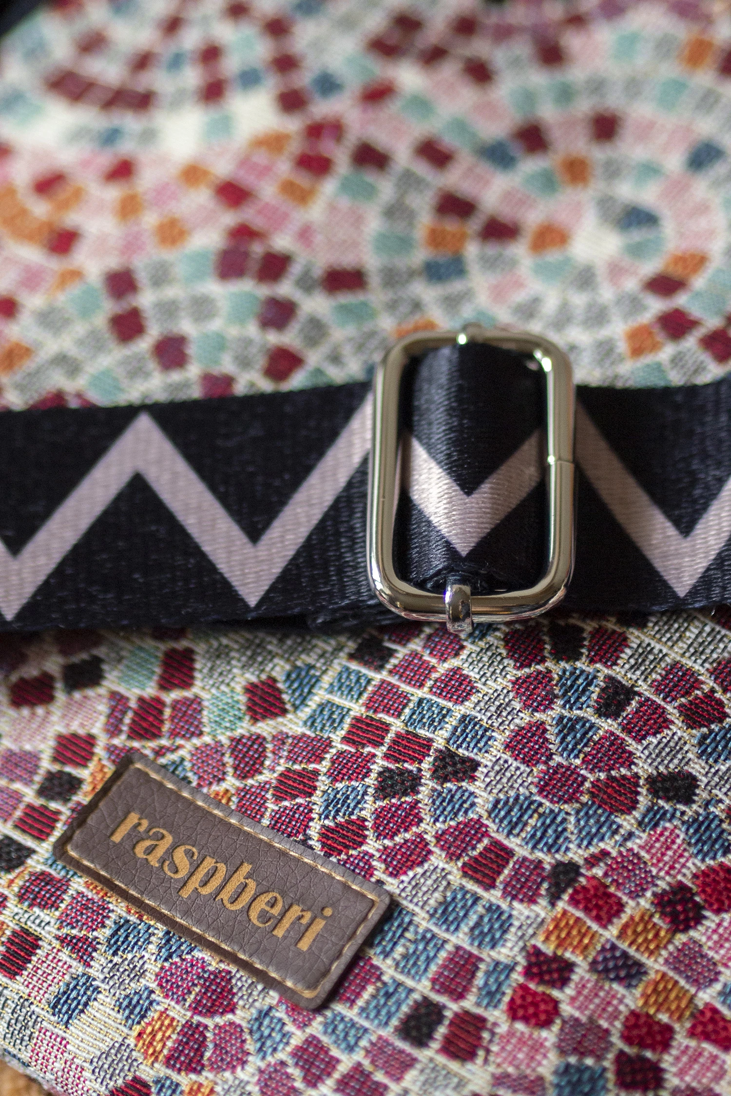 Torebka posiada regulowany, czarny pasek w zygzaki i srebrne okucia.