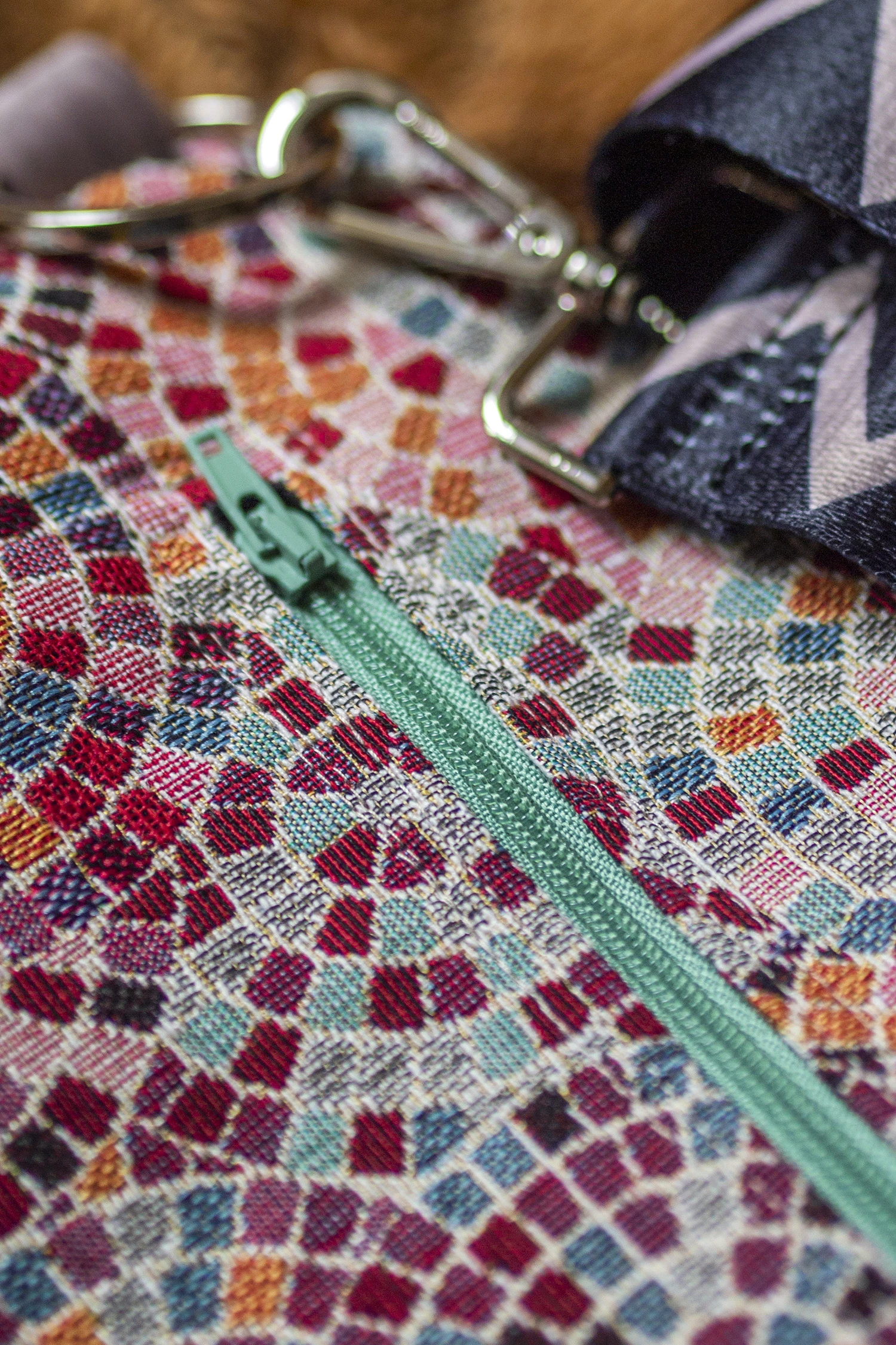 Prosta torebka, kopertówka w średnim rozmiarze wykonana z wzorzystego kolorowego żakardu. Zapinana na suwak.