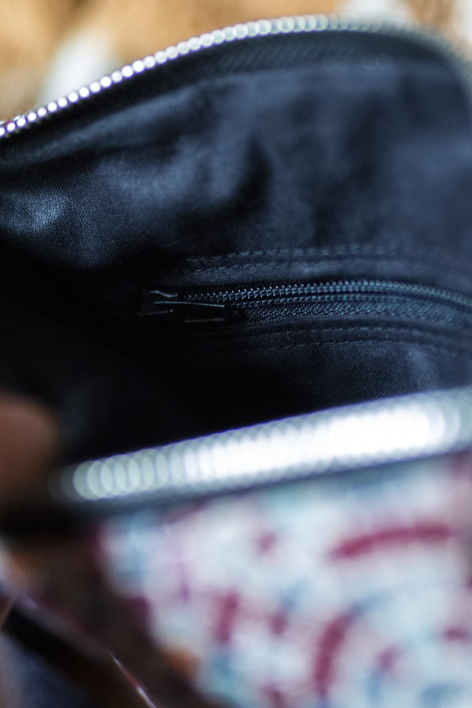 Małe zaszewki na dnie. Z tyłu oraz w środku torebki kieszonki zapinane na suwak. Środek wykończony bawełnianą podszewką.