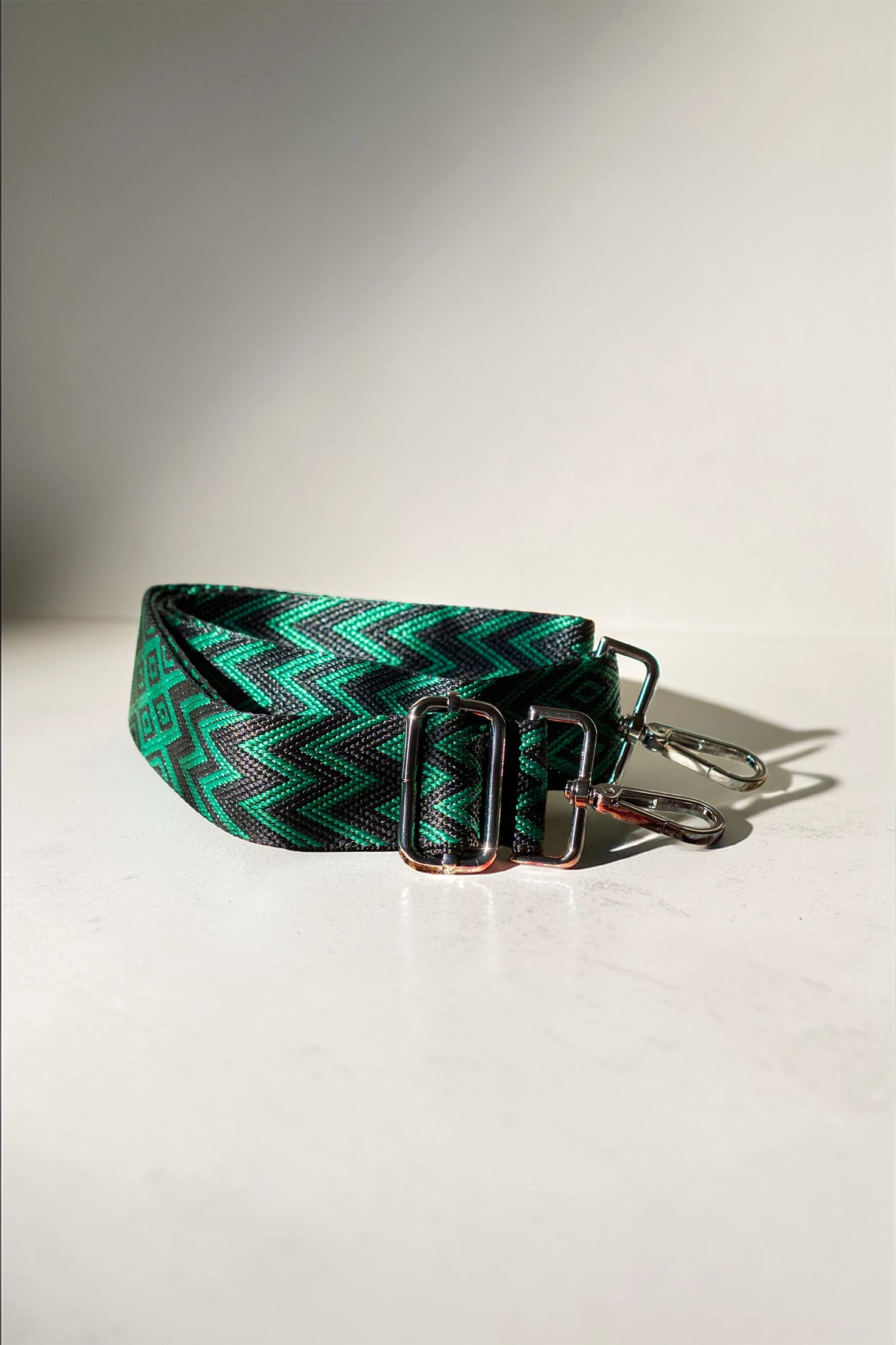 Regulowany pasek w kolorze zielono-czarnym. Srebrne okucia.