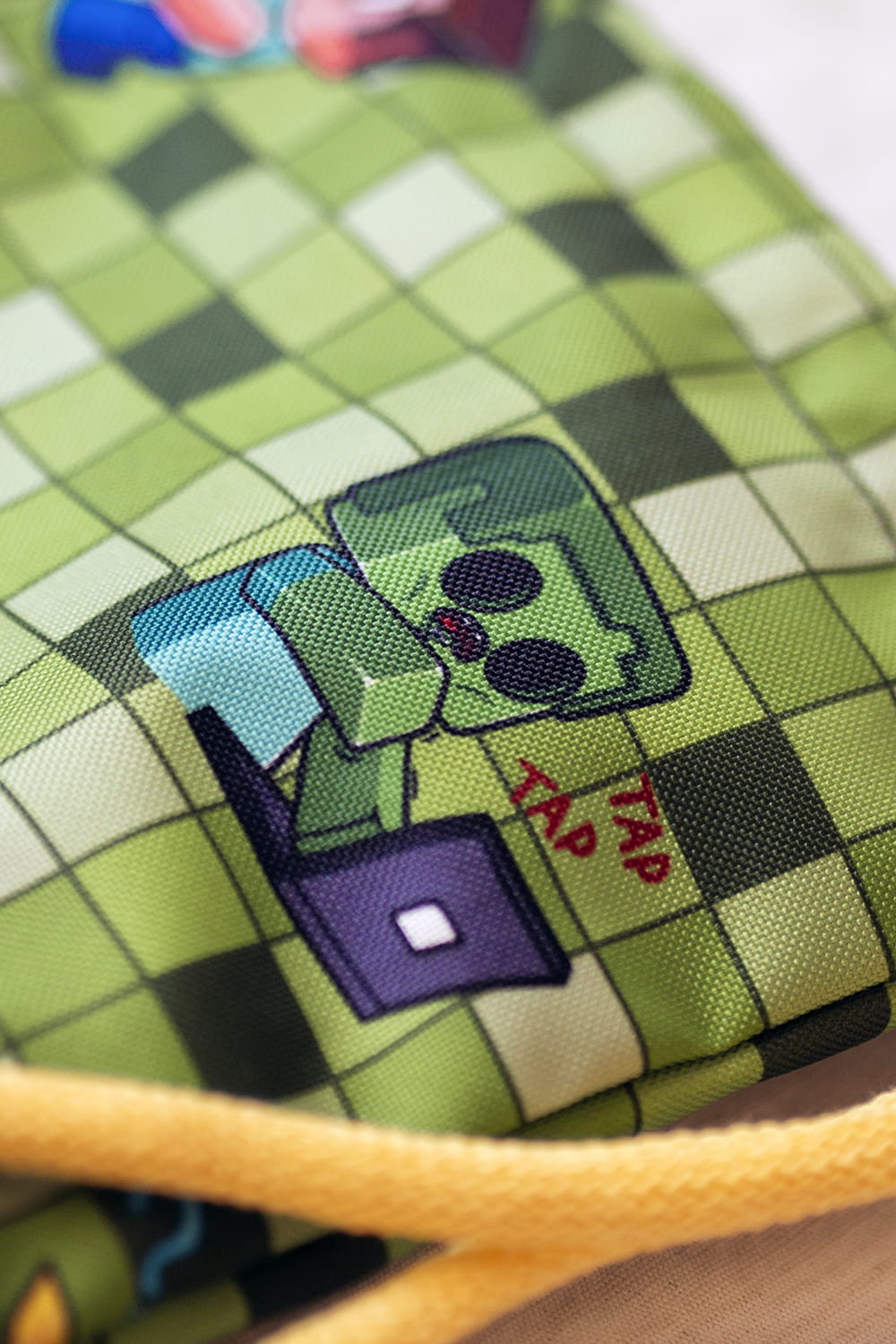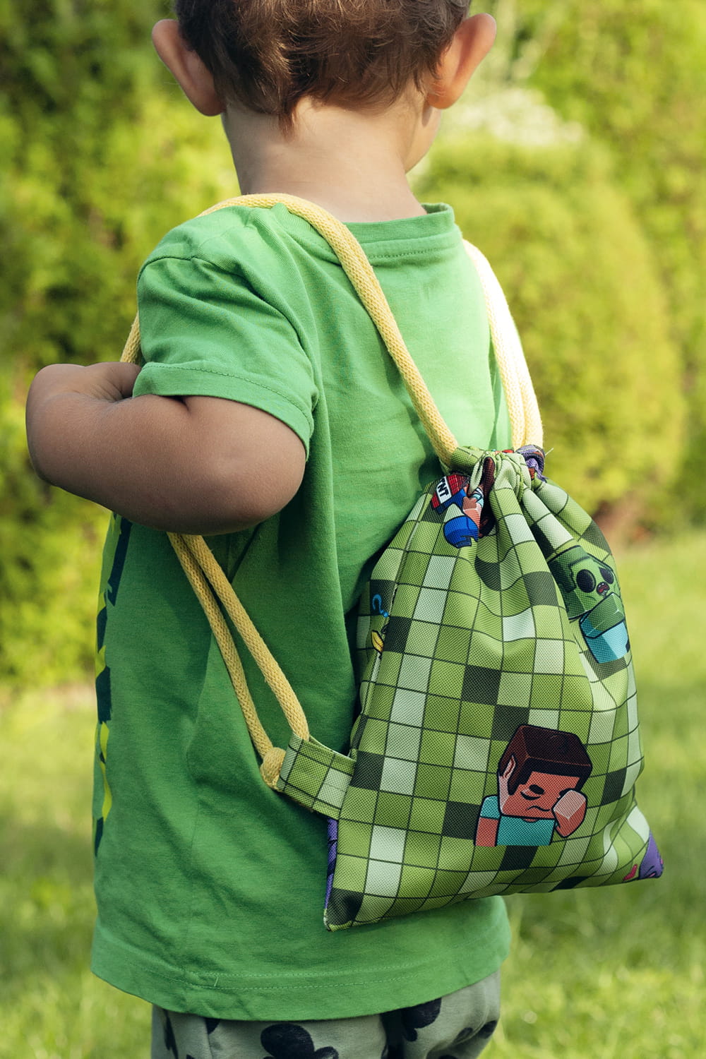 Dziecięcy plecaczek worek wykonany z wodoodpornego poliestru. Bawełniane sznurki w kolorze cytrynowym.