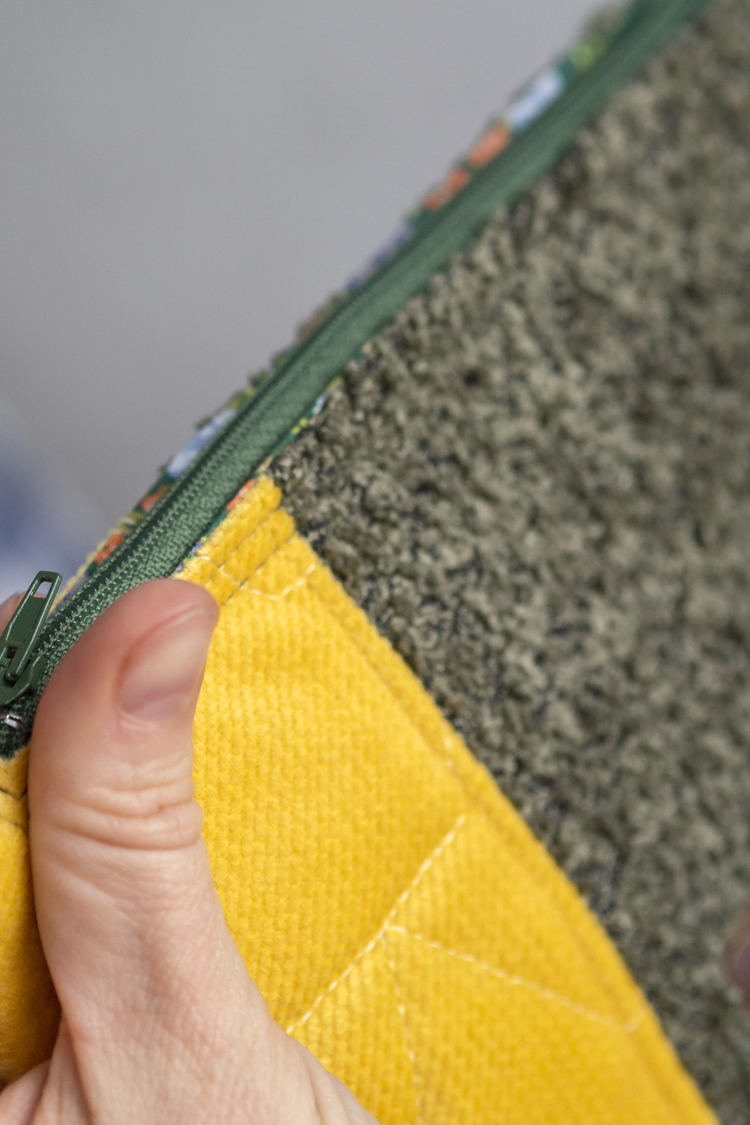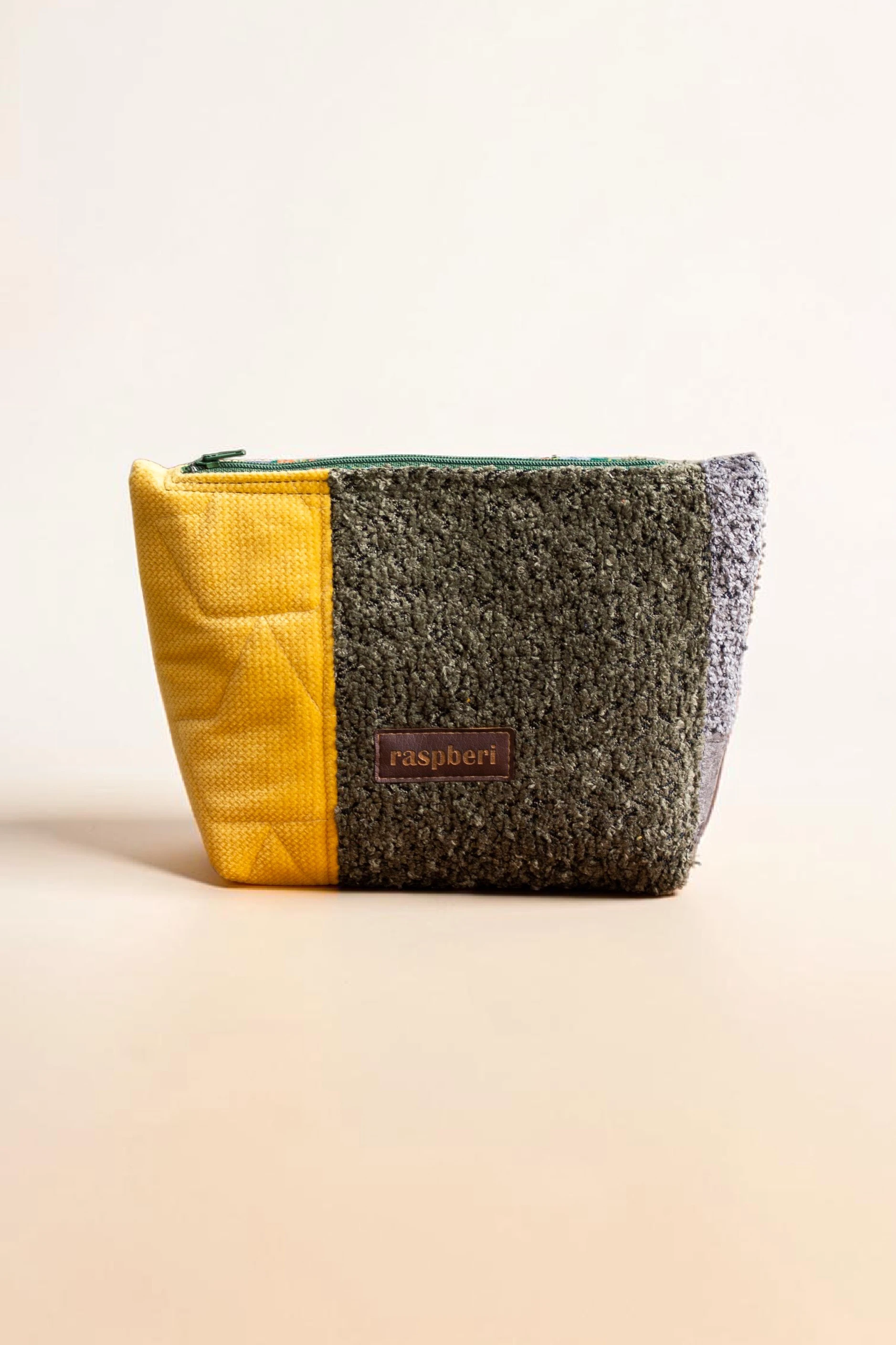 Duża kosmetyczka w kolorze żółto-zielono-szarym. Stworzona w duchu no waste.